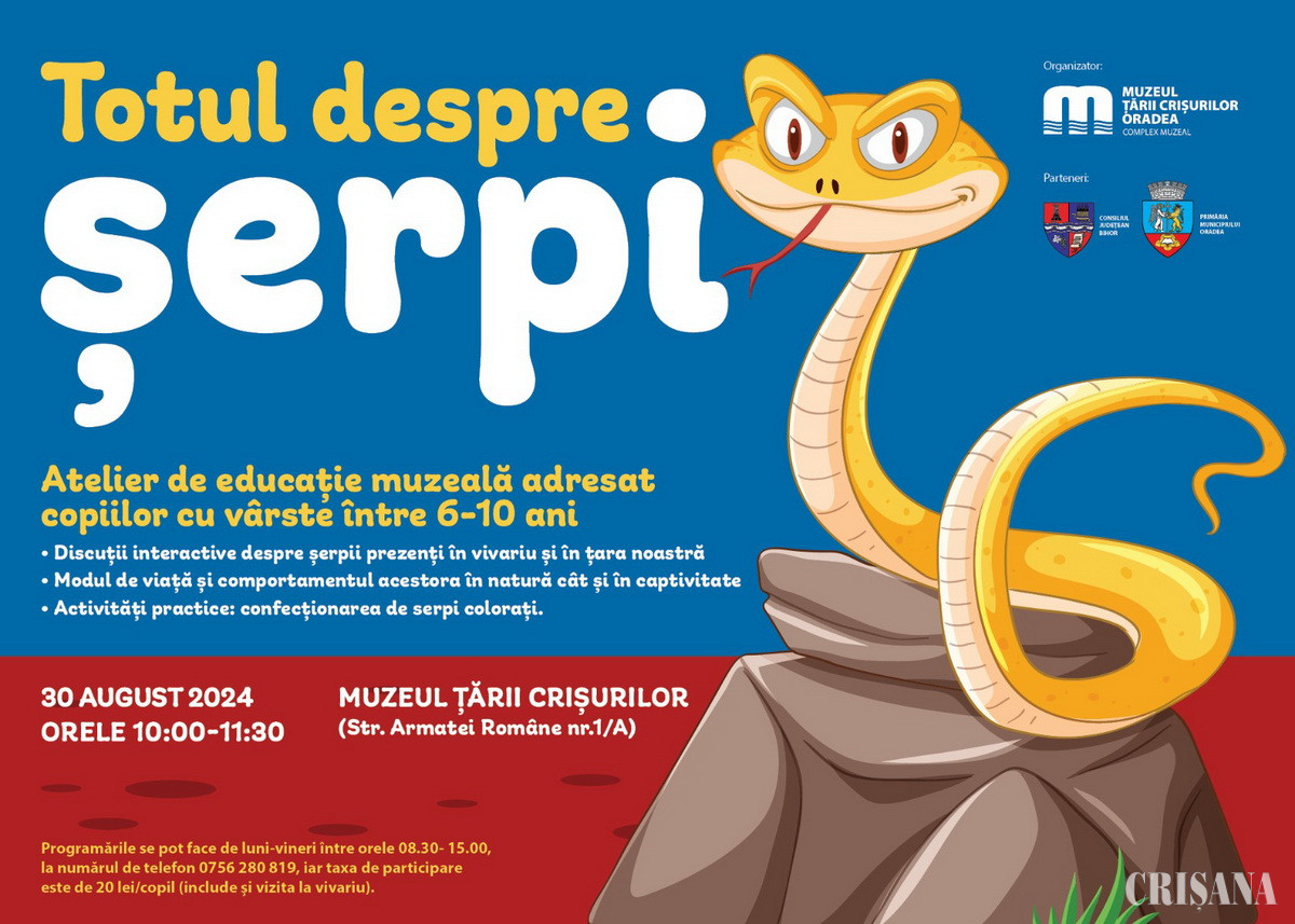 Vineri, 30 august, între orele 10.00-11.30, la sediul Muzeului Țării Crișurilor, va avea loc atelierul de educație muzeală „Totul despre șerpi”.