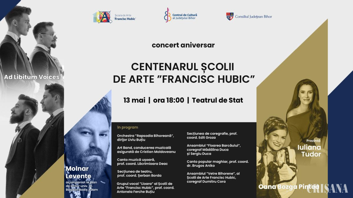 Concertul aniversar „Centenarul Școlii de Arte ”Francisc Hubic” va fi prezentat de Iuliana Tudor, una dintre cele mai îndrăgite figuri ale televiziunii române, și acompaniat de Orchestra ”Rapsodia Bihoreană”, dirijor Liviu Buțiu și Art Band, conducere muzicală - Cristian Moldoveanu.