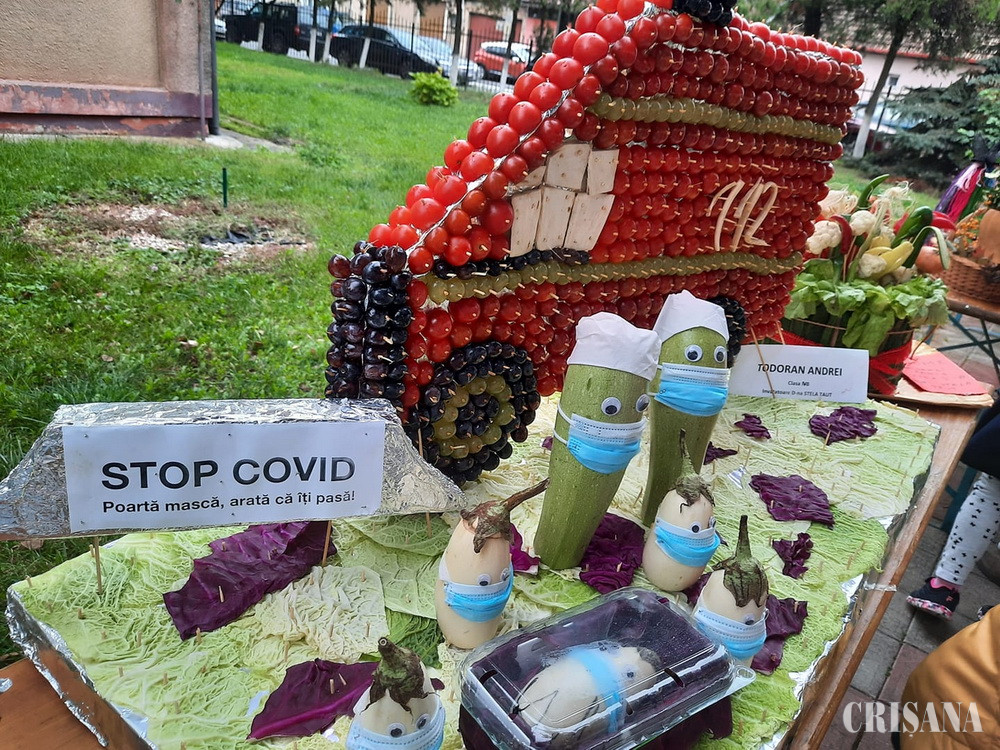 Dovlecei și vinete cu mască, pe post de cadre medicale, o ambulanță făcută din legume, care duce un bolnav (o vânătă), cu izoleta... Pe scurt, o lucrare în ton cu vremurile pe care le trăim, realizată de elevul Andrei Todoran, mesajul lucrării fiind: „Stop Covid! Poartă mască, arată că îți pasă”.