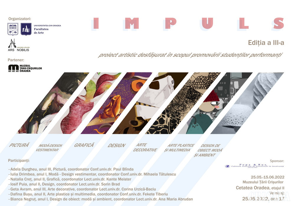 Proiectul Impuls este organizat de Departamentul de Arte Vizuale al Universității din Oradea și de Asociația Culturală Ars Nobilis, în parteneriat cu Muzeul Țării Crișurilor din Oradea şi a ajuns la cea de-a treia ediție. Obiectivul proiectului este stimularea, evidențierea și promovarea atât la nivel local, cât și la nivel național a artiștilor studenți performanți. În acest an s-a decis ca proiectele expoziționale ale studenților de la cele șapte programe de studii ale Departamentului de Arte Vizuale (Pictură, Grafică, Arte Decorative, Modă, Design Arte Plastice și Multimedia, Design de obiect: Modă și Ambient) să se concretizeze într-o expoziție la Muzeul Țării Crișurilor, Cetatea Oradea.