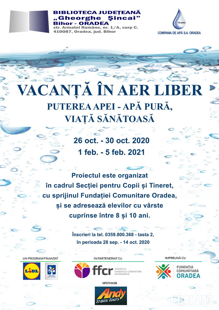 Vacanța în aer liber ,,Puterea apei - apa pură, viaţă sănătoasă” este un proiect propus de Secția pentru Copii și Tineret a Bibliotecii Județene ,,Gheorghe Șincai’’ Bihor, cu sprijinul Fundației Comunitare Oradea, program finanțat de Lidl, în parteneriat cu Federația Fundațiilor Comunitare din România. Programul dedicat copiilor se va desfăşura timp de două săptămâni, respectiv în perioada 26 – 30 octombrie 2020 și în perioada 1 februarie – 5 februarie 2021, perioade care coincid cu vacanţele şcolare pentru copiii din învăţământul primar şi pentru preşcolari. La program pot participa, pe bază de înscriere, 60 copii, cu vârste cuprinse între 8 și 10 ani (câte 30 membri în prima vacanță, 30 în a doua vacanță). Aceştia vor parcurge un program de inițiere în tainele importanței apei în viața oamenilor. Sesiunile vor dura două ore pe zi şi se vor desfăşura în intervalul orar 10.00-12.00. Activitățile se vor desfășura la Biblioteca Judeţeană „Gheorghe Şincai”, la Compania de Apă, la Stația de Epurare și în Parcul Libertății, respectiv pe malul Crișului Repede. Înscrierile se fac telefonic, la 0359/800-368 – tasta 2, în perioada 28 septembrie – 14 octombrie 2020. Participarea copiilor este gratuită, însă condiţia pe care aceştia trebuie să o îndeplinească este deţinerea unui permis de bibliotecă.