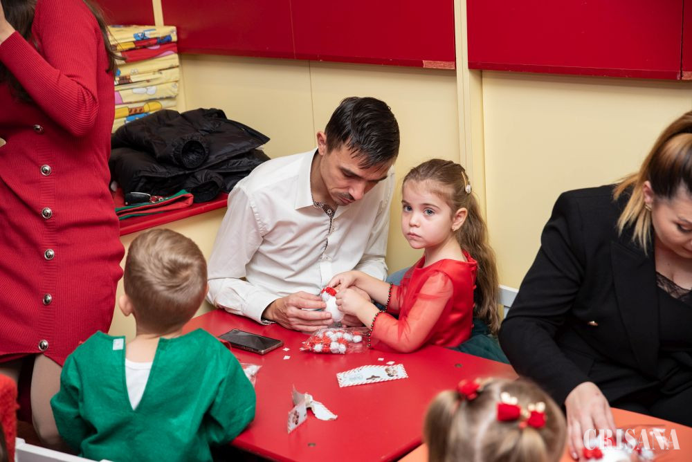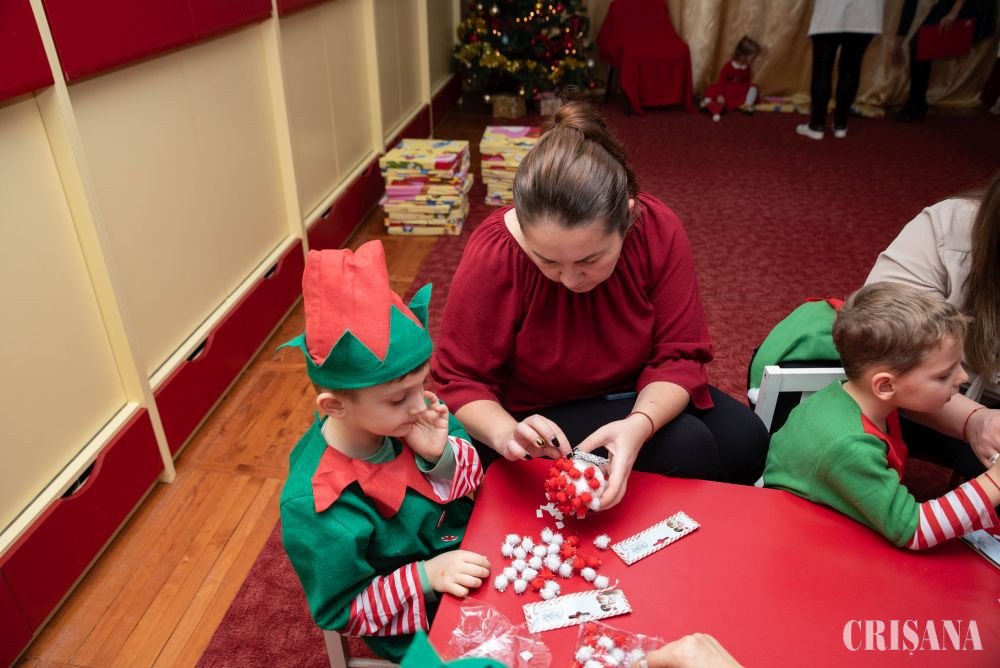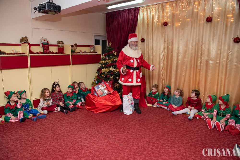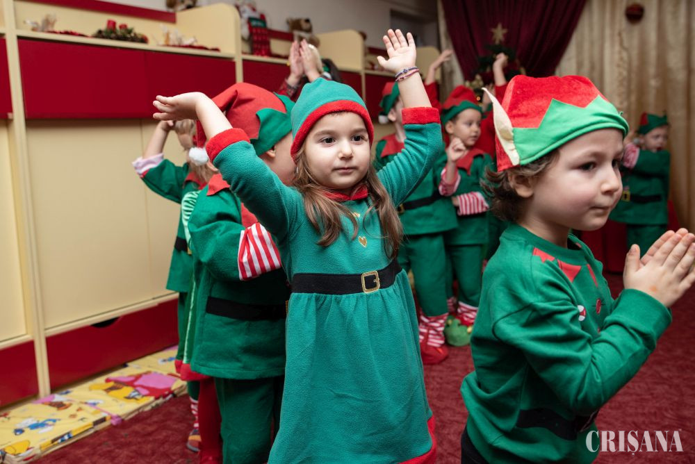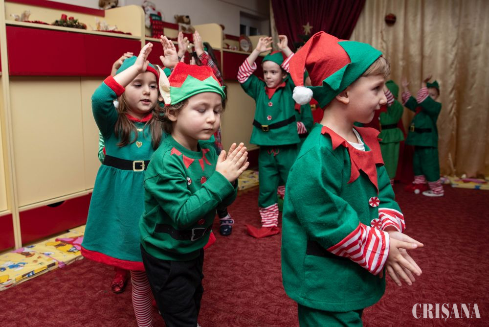 Astfel, „spiridușii” grupei mijlocii B, sub atenta îndrumare a doamnelor profesoare în educația preșcolară Teodora Negruț și Ardelean Oana, au pregătit un moment artistic în așteptarea lui Moș Crăciun. Astfel, micuții îmbrăcați în costume de spiriduși s-au oferit în acest an să fie ajutorul Moșului. Au cântat cântecele dedicate Moșului atât în limba română, cât și în limba engleză, ajutați de doamna profesoară de limba engleză - Oana Simuț și au dansat pe muzică de sezon coordonați de către instructorul lor de dans, Andrei Culda. Mai apoi, împreună cu părinții lor, au confecționat un glob de Crăciun, care urmează a fi atârnat în bradul fiecăruia de acasă.