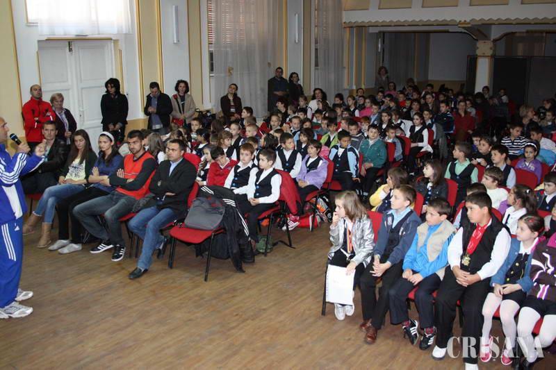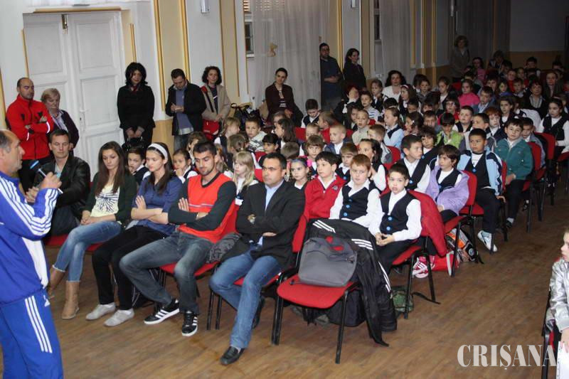 Antrenorul Virgil Preda de la CSU-CSM Oradea a adus cu el patru atleţi ai clubului care s-au remarcat de-a lungul timpului atât prin sport, cât şi prin realizările profesionale. Directorul Andrei Cristea a deschis întâlnirea, spunându-le celor mai mici elevi ai liceului că astăzi au prilejul să cunoască adevărate modele de urmat în viaţă, care au reuşit să împletească armonios sportul de performanţă cu şcoala. „Sportivul de performanţă, ca şi voi, de altfel, sunteţi nişte diamante pe care antrenorul şi profesorul încep să le şfeluiască pentru a le face strălucitoare", le-a transmis prichindeilor din sală directorul Cristea. Profesorul Virgil Preda le-a explicat apoi copiilor că sportul poate fi împletit armonios cu învăţătura, recunoscând cinstit că este adeptul unei educaţii severe, dar corecte. El le-a transmis, de altfel, micuţilor, fără menajamente, „lăsaţi televizorul, calculatorul şi alte prostii şi faceţi sport. Părinţii voştri vor de la voi să fiţi sănătoşi, să aveţi un corp frumos, să învăţaţi bine şi astfel să vă realizaţi profesional. Toate acestea se pot realiza, practicând sportul. Dacă în Grecia antică sportul era obligatoriu pentru tineri, la noi, după aproape 3.000 de ani, au scos sportul din şcoli şi am ajuns o naţiune cu copii şi bătrâni bolnavi". El le-a explicat apoi că un model de urmat reprezintă, de fapt, o persoană care a devenit o personalitate, prezentându-i apoi pe atleţii orădeni. Rând pe rând, Silviu Uivaroşan (student la Facultatea de Inginerie Managerială), Ligia Grozav (cls. XI-a la LPS Bihorul), Ion Vasile (profesor la Facultatea de Ştiinţe) şi Cornelia Deac (studentă la Psihologie) le-au vorbit elevilor despre programul lor zilnic, împărţit între şcoală şi antrenamente. Campioana României la săritura în lungime, Cornelia Deac, a fost cea mai solicitată de micuţi, care au fost curioşi să afle cât timp se antrenează pe zi Cornelia, cum se descurcă cu şcoala, la ce oră se culcă seara, la cât se trezeşte, ce mănâncă...