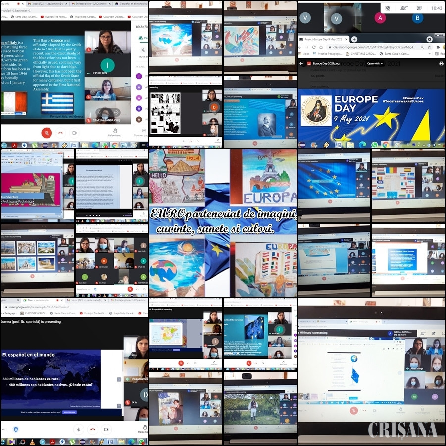 Acestea au fost încununate printr-o videoconferiță intitulată ,,EUROparteneriat de imagini, cuvinte, sunete și culori”, care a avut, în deschidere, frumoasele cuvinte adresate participanților de către pr. prof. Radu Rus, directorul Liceului Ortodox ,,Ep. Roman Ciorogariu”, gazdă a evenimentului. A urmat intonarea Imnului Europei (în limba germană), semn al bucuriei de a fi european. În cadrul acestei întâlniri, fiecare participant la proiect și-a prezentat contribuția. Astfel, sub coordonarea doamnelor profesoare Ioana-Paula Hice și Ana Patricia Marcu, au luat cuvântul următorii participanți: eleva Alexia Dache de la Colegiul Național „Iosif Vulcan”, coordonată de prof. Estera Chelariu, prof. Ana Patricia Marcu - colaj de desene, Aryana Holhoș, Alesia Hanga de la Șc. Gimnazială Nr. 11, Oradea, coordonate de prof. Simona Avram și prof. Dana Mihincău, împreună cu eleva Iris Iepure de la Colegiul Național „Iosif Vulcan’.