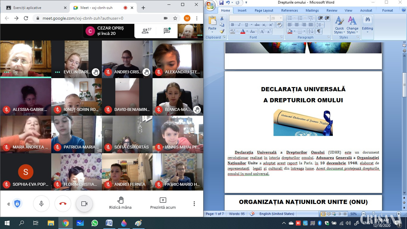 Elevii clasei a IV-a A, de la Liceul Ortodox „Episcop Roman Ciorogariu” Oradea, coordonați de doamna învățătoare Eva-Maria Tirpe, au desfășurat activitatea în două părți. Prima parte s-a concretizat într-o prezentare și o dezbatere despre drepturile omului, despre Declarația universală a drepturilor omului, despre eforturile Organizației Națiunilor Unite de a plasa drepturile omului în prim plan, de a combate conflictele și abuzurile și de a realiza o pace durabilă pe plan internațional. Copiii, cetățeni europeni, au aflat că Uniunea Europeană are o poziție fermă în acest sens și că, în cadrul forurilor ONU, apărarea drepturilor omului este o prioritate a acesteia, iar în a doua parte a activității, elevii au primit sarcina ca, pornind de la activitatea din clasă, să realizeze câte o lucrare individuală în care să reprezinte, plastic sau literar, un drept al omului. Aceste lucrări vor constitui temele unei expoziții, alături de cele realizate în cadrul activității „World’s Largest Lesson 2020”, inițiat de UNICEF cu ocazia sărbătoririi Zilei Internaționale a Drepturilor Copilului, pe 20 noiembrie, dată care marchează adoptarea Convenției cu privire la drepturile copilului.