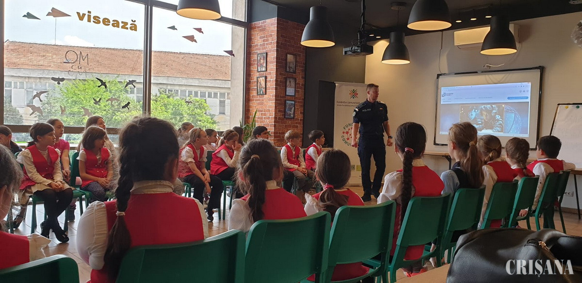 Copiii din clasa a doua, coordonați de Valeria Bunica, împreună cu cei din clasa a treia, coordonați de Lucia Galan, de la Liceul de Arte din Oradea, au participat marți, 21 mai, la un atelier de informare privind siguranţa pe Internet, sub genericul „Educație digitală pentru cei mici”. Scopul activității a fost informarea cu privire la principalele modalități de utilizare în siguranță a Internetului. Au fost dezbătute teme referitoare la siguranța pe Internet, reguli de autoprotecție în mediul virtual, drepturile de autor, traficul de persoane etc. Micuții au fost foarte receptivi, ascultând sfaturile polițiștilor și implicându-se în dialog.