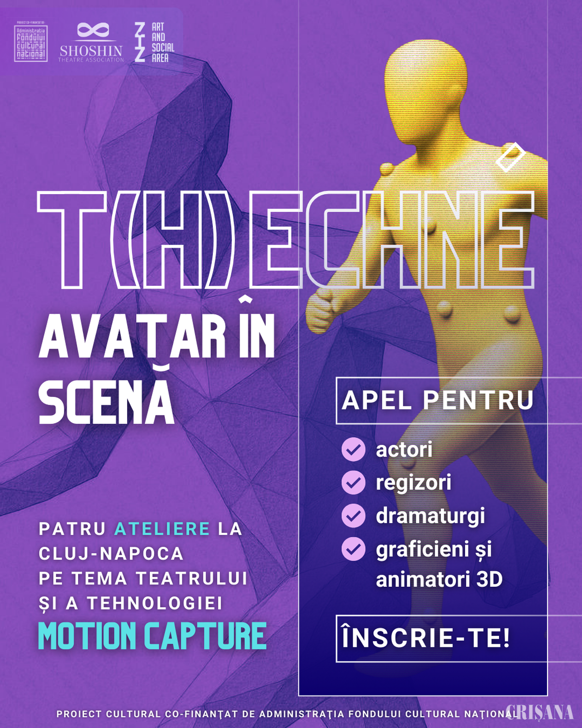 Asociația teatrală Shoshin invită dramaturgi, actori/regizori și graficieni/animatori 3D să participe la proiectul „T(H)ECHNÉ: Avatar în Scenă. De la jocul copiilor, spre dublul digital. O scenă între lumi”.