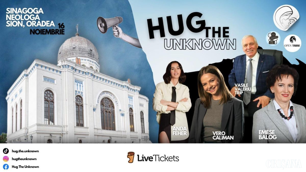 Sinagoga Neologă Sion din Oradea va găzdui sâmbătă, 16 noiembrie, un eveniment cu adevărat unic: „Hug The Unknown”. Evenimentul, ce se va desfășura între orele 14.00 și 17.00, este dedicat tuturor celor care doresc să își descopere potențialul și să învețe cum să depășească cu succes provocările vieții într-o lume în continuă schimbare.