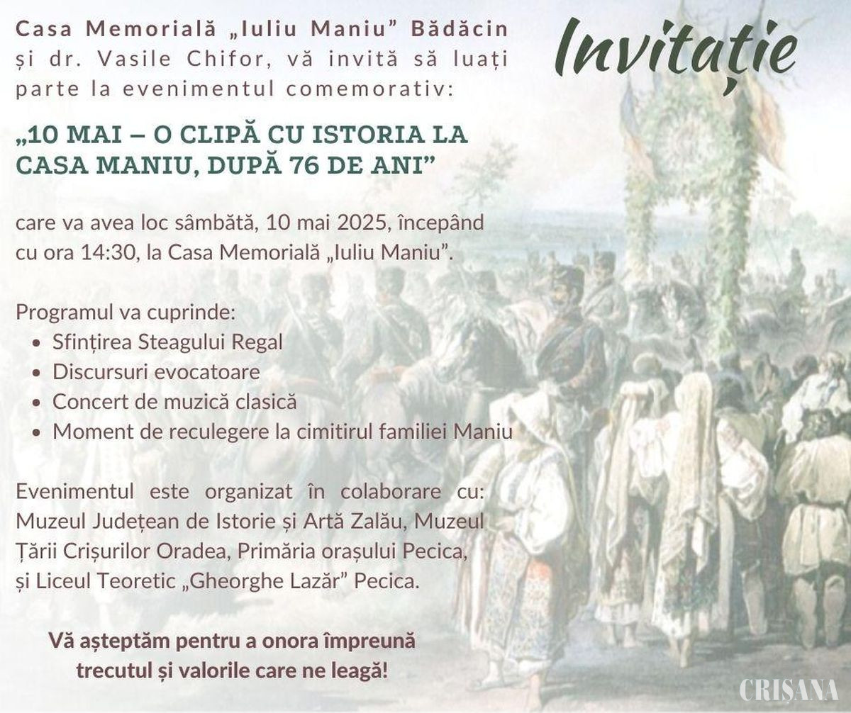 Sâmbătă, 10 mai, începând cu ora 15.00, în cadrul evenimentului „10 Mai – O clipă cu Istoria la Casa Maniu, după 76 de ani”, organizatorii – dr. Vasile Chifor și Casa Memorială Iuliu Maniu – invită publicul să participe la o celebrare cu profundă încărcătură istorică și spirituală.