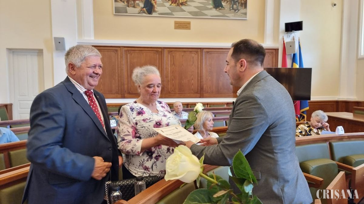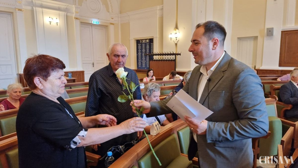 „La mulți ani și multă sănătate celor care sărbătoriți astăzi 50 de ani de căsnicie! Sunteți un adevărat exemplu pentru noi. Vă consider niște oameni binecuvântați și adevărați eroi, mai ales în vremurile pe care le trăim. Sunteți un model pentru generațiile tinere, care trebuie să înțeleagă că adevărata fericire vine din construirea unei vieți împreună, din momentele împărtășite, din bucurii, dar și din provocările depășite cu răbdare și iubire. Municipalitatea orădeană apreciază profund acest angajament și model de viață. Gestul nostru de astăzi este o formă prin care dorim să vă arătăm că sunteți prețuiți și că povestea dumneavoastră are un loc important în inima orașului nostru. Vă dorim să continuați acest drum cu sănătate, liniște și bucurie alături de cei dragi. Sperăm ca anii ce vor urma să fie la fel de frumoși și plini de iubire ca cei pe care i-ați petrecut împreună până acum. Vă mulțumesc și vă felicit din inimă pentru această realizare extraordinară”, a transmis viceprimarul Teofil Filimon.