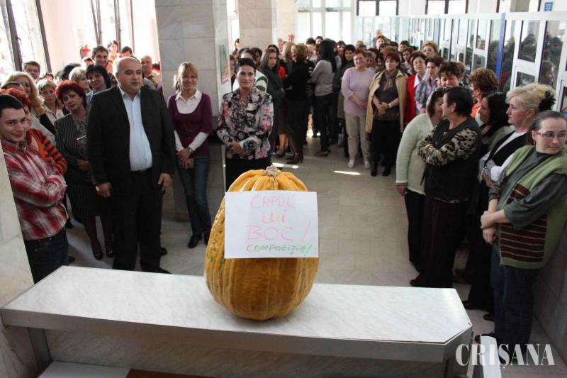 Mai mult, pentru a-şi exprima şi mai mult nemulţumirea faţă de măsurile luate de Guvenul Boc, funcţionarii orădeni au ornat un dovleac cu un afiş pe care era scris: "Capul lui Boc!Compoziţie!". Protestul spontan a stârnit însă nemulţumirea zecilor de contribuabili care au venit să-şi achite dările şi taxele către stat, pentru unii această zi fiind ultima în care mai puteau face unele plăţi.
