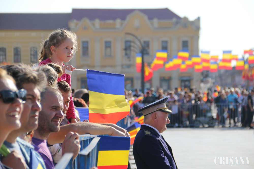 Oraș împodobit în tricolor, mii de oameni cu steaguri, școlari în grupuri compacte și polițiști și jandarmi la fiecare colț de stradă, așa a arătat vineri, în jurul orei 15.00, atmosfera din Piața Unirii, la cea mai importantă zi pentru municipiu, ziua Oradiei.