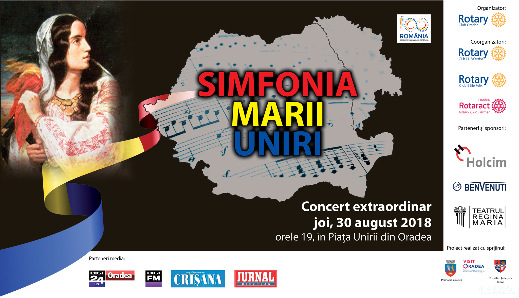 Joi, 30 august, începând cu ora 19.00, în Piața Unirii, va avea loc un concert vocal-simfonic extraordinar dedicat Centenarului, intitulat „Simfonia Marii Uniri”. Cu acest prilej, vor evolua Corul și Orchestra Simfonică a Filarmonicii de Stat Oradea, soprana Tatiana Costiuc (R. Moldova) și violonistul Remus Rîmbu.