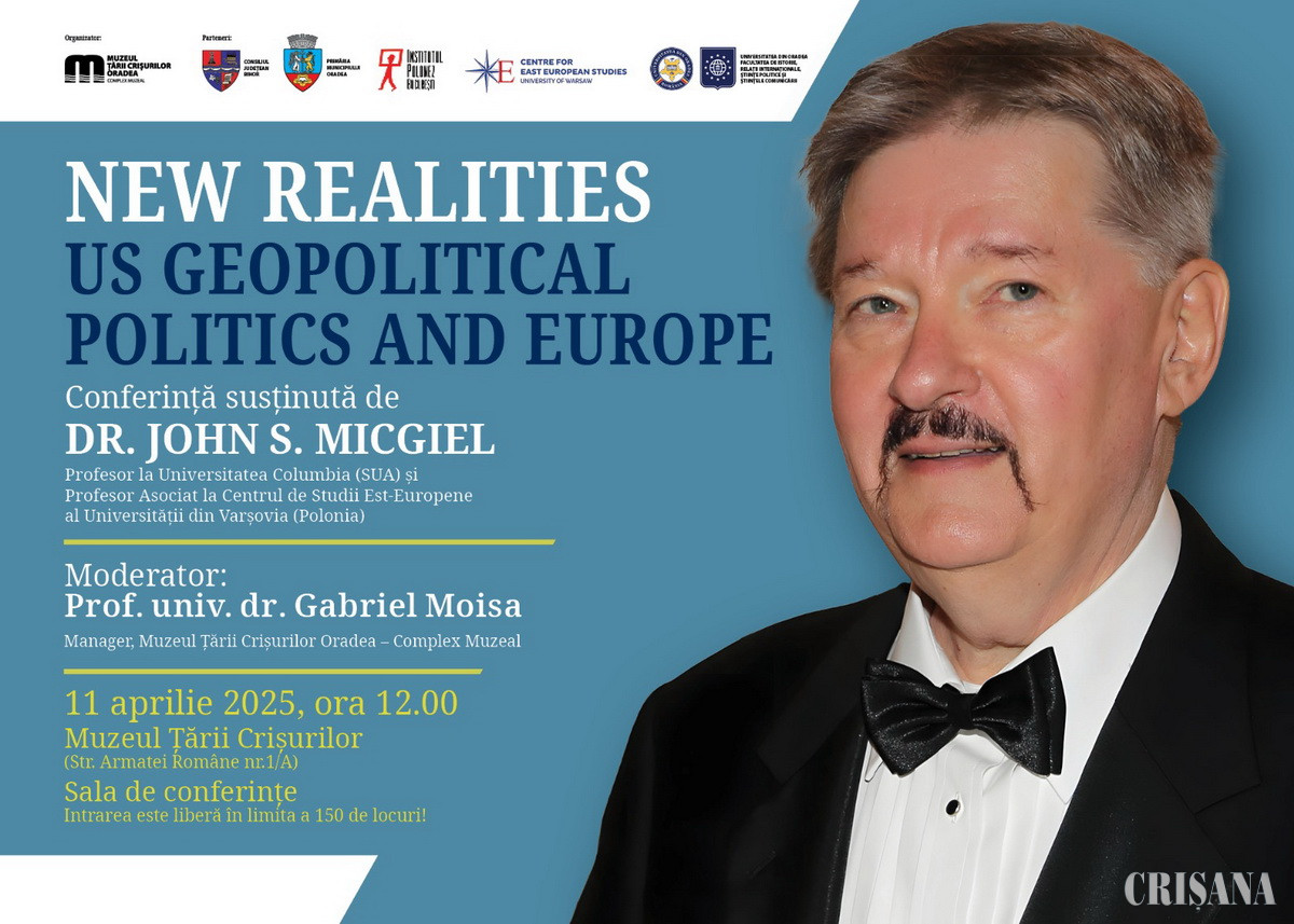 În Sala de conferințe a Muzeului Țării Crișurilor, vineri, 11 aprilie, de la ora 12.00, va avea loc conferința „New Realities - U.S. Geopolitical Politics and Europe”, susținută de dr. John S. Micgiel.