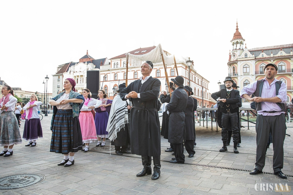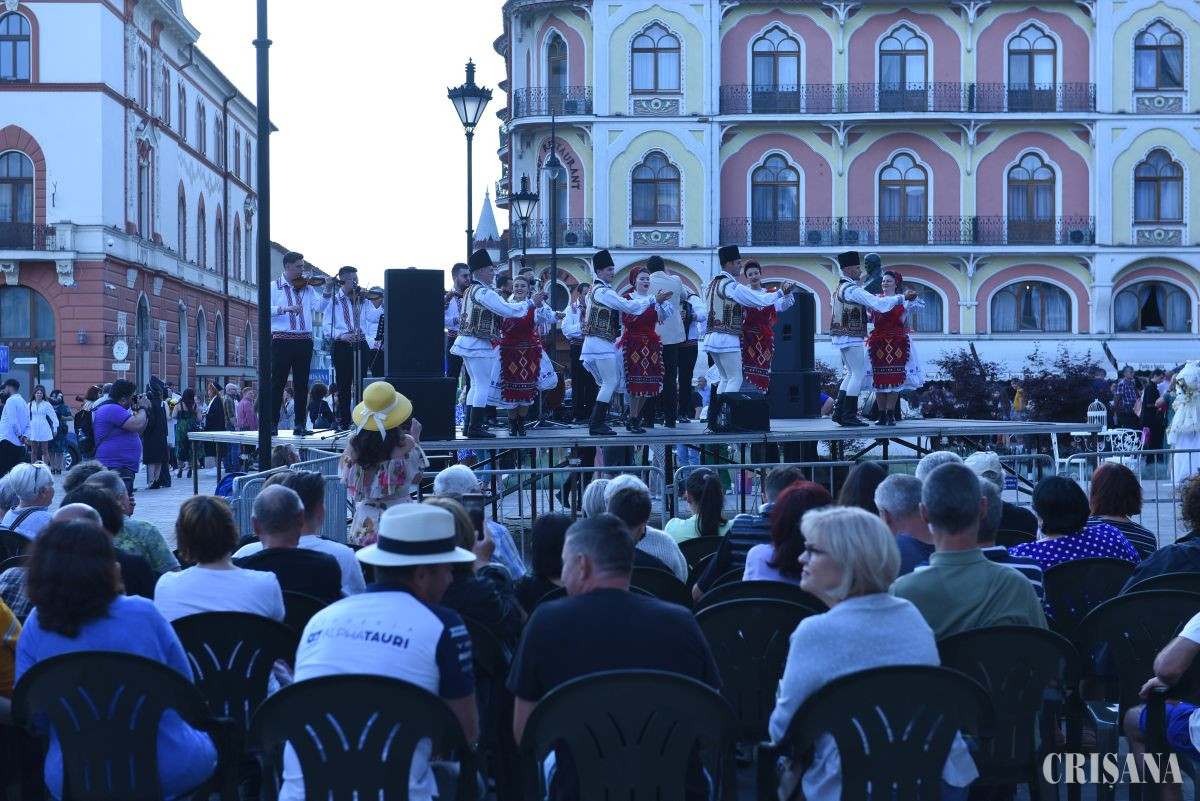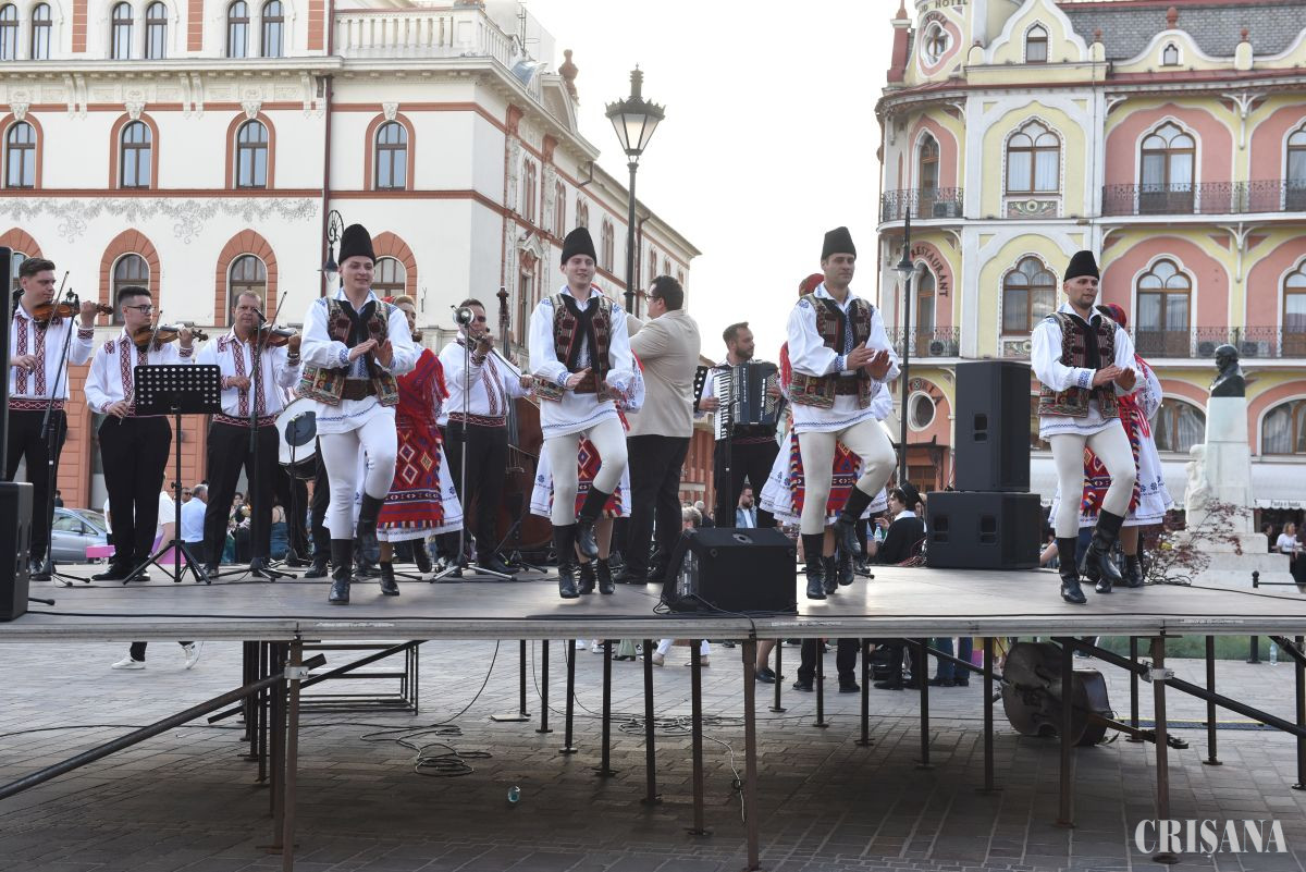 Zona din fața Teatrului Regina Maria a fost plină miercuri, la ora 19.00, când pe scenă a urcat Ansamblului Artistic Profesionist Crișana. A urmat o surpriză din partea actorilor orădeni care au prezentat mai multe scene muzicale din unul din cele mai de succes spectacole, „Scripcarul de pe acoperiș”. În aplauzele orădenilor care s-au înghesuit să fotografieze și să filmeze cu telefoanele, pe scenă a urcat Grupul Iza.