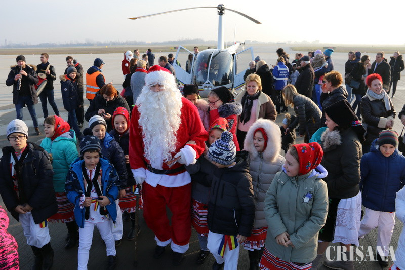 Moș Crăciun a aterizat pe Aeroportul Oradea, în jurul orei 10.00, cu sacul plin de cadouri, fiind luat cu asalt de copii.
