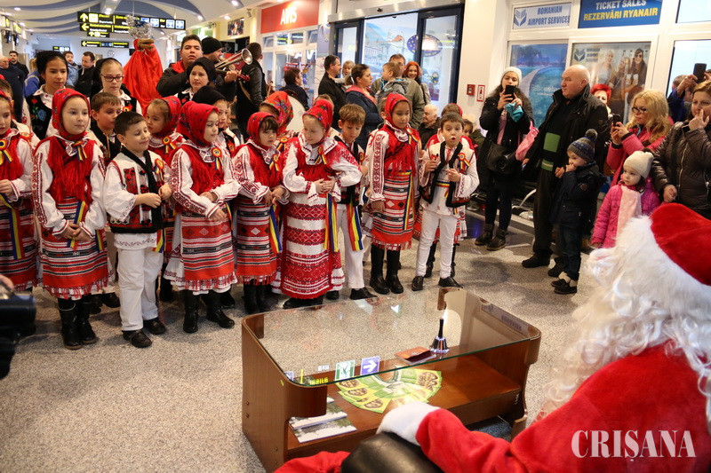 Forfotă mare, ieri dimineață, pe Aeroportul Oradea, unde zeci de copii, de diferite vârste, au venit să-l întâlnească pe Moș Crăciun. Printre ei s-au aflat și membrii Ansamblului „Mugurelul Bihorului” al Școlii Gimnaziale „Dimitrie Cantemir” din Oradea, coordonat de prof. Doina Lung. Îmbrăcați în frumoase costume populare, copiii au pregătit obiceiul „Noi umblăm a colinda” pentru marea întâlnire cu Moșul.