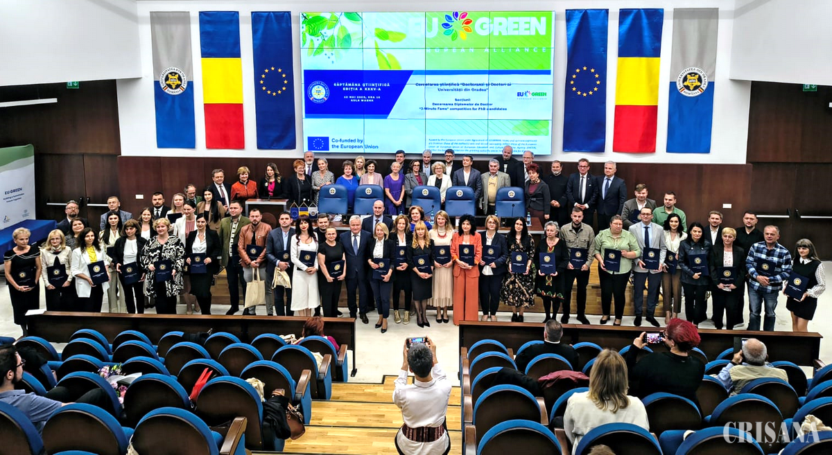 La inițiativa conducerii Universității din Oradea, doctoranzii care au reușit să ajungă în faza finală a concursului EU GREEN „3 minutes of fame” și aceia care au obținut titlul de „Doctor în Științe” în perioada mai 2024 – mai 2025 au primit diplome, premii și flori.