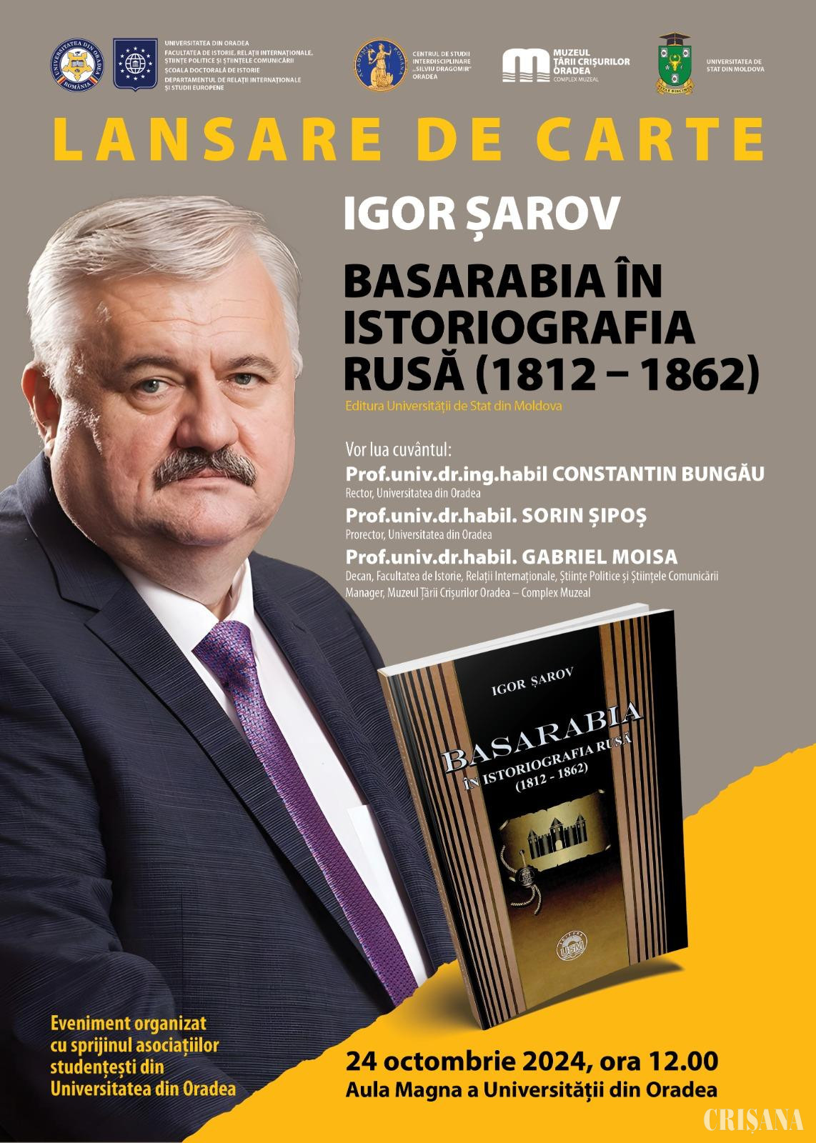 Prof. univ. dr. Igor Șarov, rector al Universității de Stat din Moldova, lansează, la Universitatea din Oradea, volumul „Basarabia în istoriografia rusă (1812-1862)”. Evenimentul dedicat tuturor celor pasionați de istorie va avea loc în Aula Magna a Universității din Oradea, joi, 24 octombrie, de la ora 12.00.