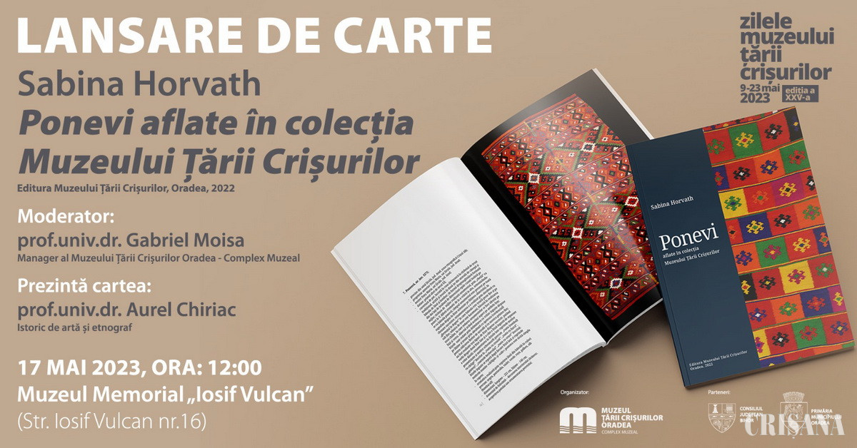 Miercuri, 17 mai, ora 12.00, la Muzeul Memorial „Iosif Vulcan” (Str. Iosif Vulcan nr.16), va avea loc lansarea cărții „Ponevi aflate în colecția Muzeului Țării Crișurilor”, autoare Sabina Horvath.