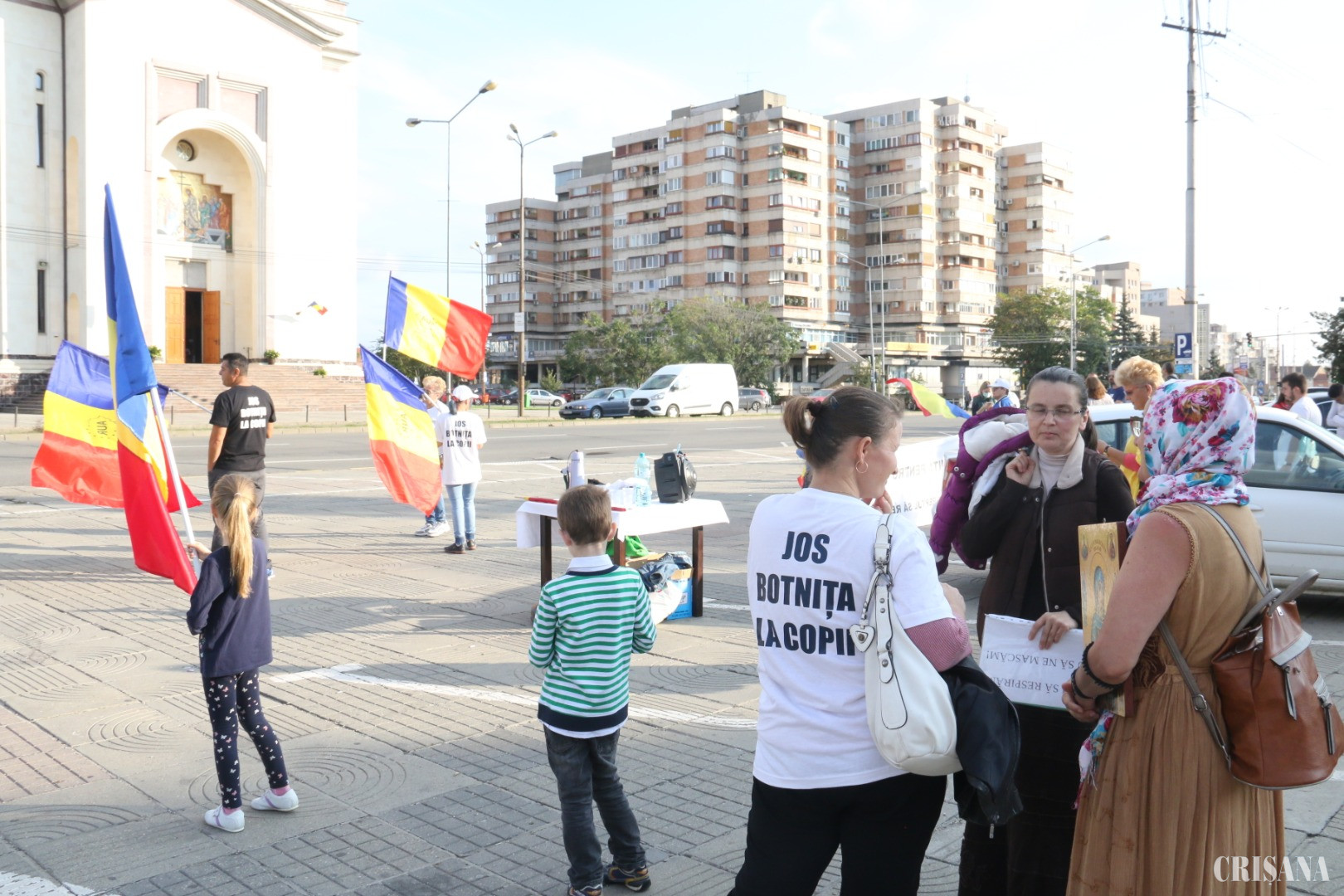 Faptul că erau doar 25-30 de persoane nu i-a descurajat deloc. Aceștia au purtat tricouri inscripționate cu „Jos botnița pentru copii. Copiii au dreptul să respire”, foi A4 inscripționate cu „Nu ne mai mințiți” sau „Terminați cu mascarada”, „Masca îl subjugă, e copil nu slugă”. Evenimentul a avut un puternic caracter naționalist. Protestatarii au venit cu steaguri și au pus cântece patriotice precum „Tu, Ardeal”, „Treceţi, batalioane române, Carpaţii” sau „Basarabie frumoasă”. Mai mult, printre „patrioții de paradă”, câțiva tineri strângeau semnături pentru George Simion de la partidul Alianţa pentru Unirea Românilor (AUR).