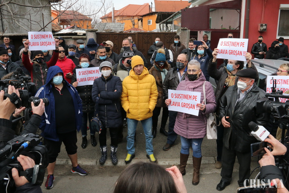 Lume pestriță adunată, ieri, în fața Colegiului Medicilor Bihor. Cu mască și fără mască (deși poliția și jandarmeria era la 30 de metri de locul evenimentului și protestatarii nu aveau nicio treabă cu distanțarea socială), pensionari, foști pacienți, agitatori, oameni îmbrăcați sărăcăcios, cu icoane în brațe sau cu pancarte pe care scria „O susținem pe Flavia Groșan”, s-au adunat cu câteva minute înainte de sosirea pneumologului în fața Colegiului. Cei peste 80.000 de fani de pe Facebook se „diluaseră” între timp, străduța pe care se află Colegiul fiind umplută cu maxim 150 de persoane. Din lipsă de ocupație, o parte dintre protestatarii de paradă se rățoiau la ziariști „Cine te plătește pe tine mă, să mă întrebi de ce nu port mască?”, a tunat unul din bărbații care se bucura totuși că cineva îi pune întrebări. O altă doamnă cu părul alb, sublinia în fața camerelor că nu a venit doar să o susțină pe Flavia Groșan ci și să îi conteste pe cei care au denunțat-o (deși Colegiul Medicilor spusese încă de săptămâna trecută că s-a autosesizat). Peste toți, o voce răgușită repeta, ca o moară stricată, „a spus Tătaru că omului sănătos îi dăunează masca”. Un altul se împleticise în propria logică: „Cu ce drept ne ucid? Cu ce drept ne țin în viață?”. Chiar și o parte dintre cei care îl înconjurau, izbucniseră în râs.