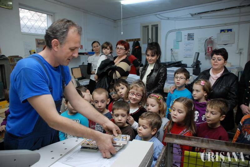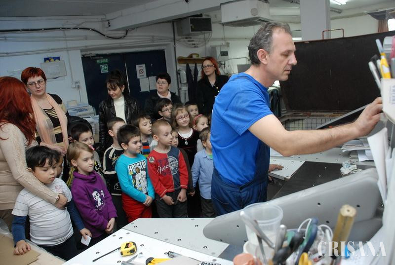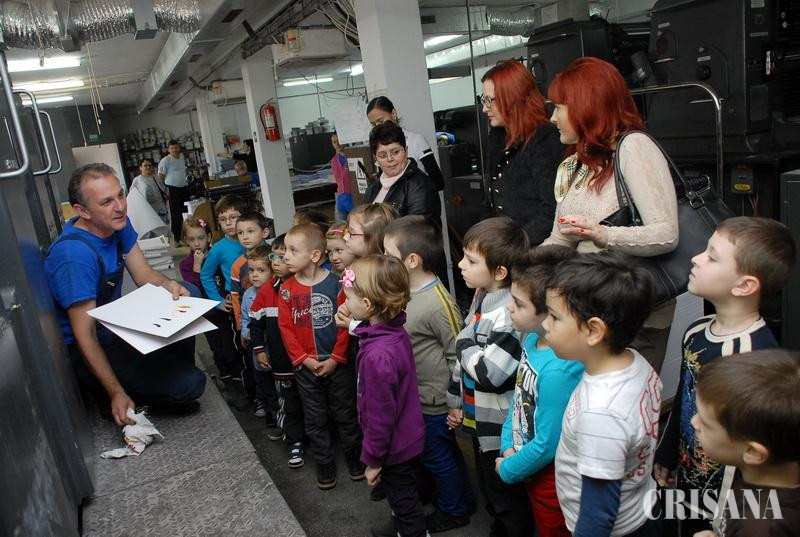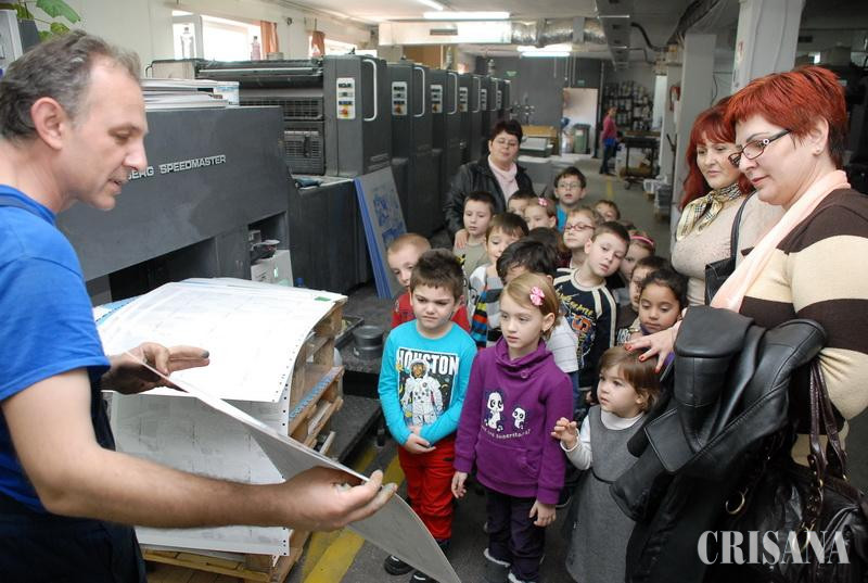 Acţiunea a avut loc la ora 10.00 şi a făcut parte din proiectul tematic "Cartea", organizat de educatoarele Anca Jarca şi Alina Ferche, în colaborare cu Mărioara Bercea, Cristina Şerban, Rodica Trif, Ecaterina Caciora şi directoarea Viorica Pop. Pornind de la maxima că „cine are carte are parte", educatoarele au vrut să le cultive copiilor interesul pntru citit şi să îi ajute să vadă cum se fabrică efectiv minunatele cărţi de poveşti pe care ei le citesc. "Săptămâna trecută am observat că cei mici sunt foarte curioşi nu doar de cuprinsul cărţilor, ci şi de coperţile lor frumoase, întrebându-ne de unde vin. Aşa că am decis să îi luăm cu noi în această vizită pentru ca să vadă cum se tipăreşte o carte, să le arătăm întregul parcurs al cărţilor din care ei învaţă", a spus, pentru Crişana, educatoarea Alina Ferche. Pe lângă vizita instructivă la care au participat, micuţii au mai aflat de câte feluri sunt cărţile, unde sunt păstrate, unde sunt expuse pentru vânzare, din ce materiale sunt făcute, din ce se face hârtia, cum trebuie păstrate şi cine le corectează înainte de a fi tipărite.