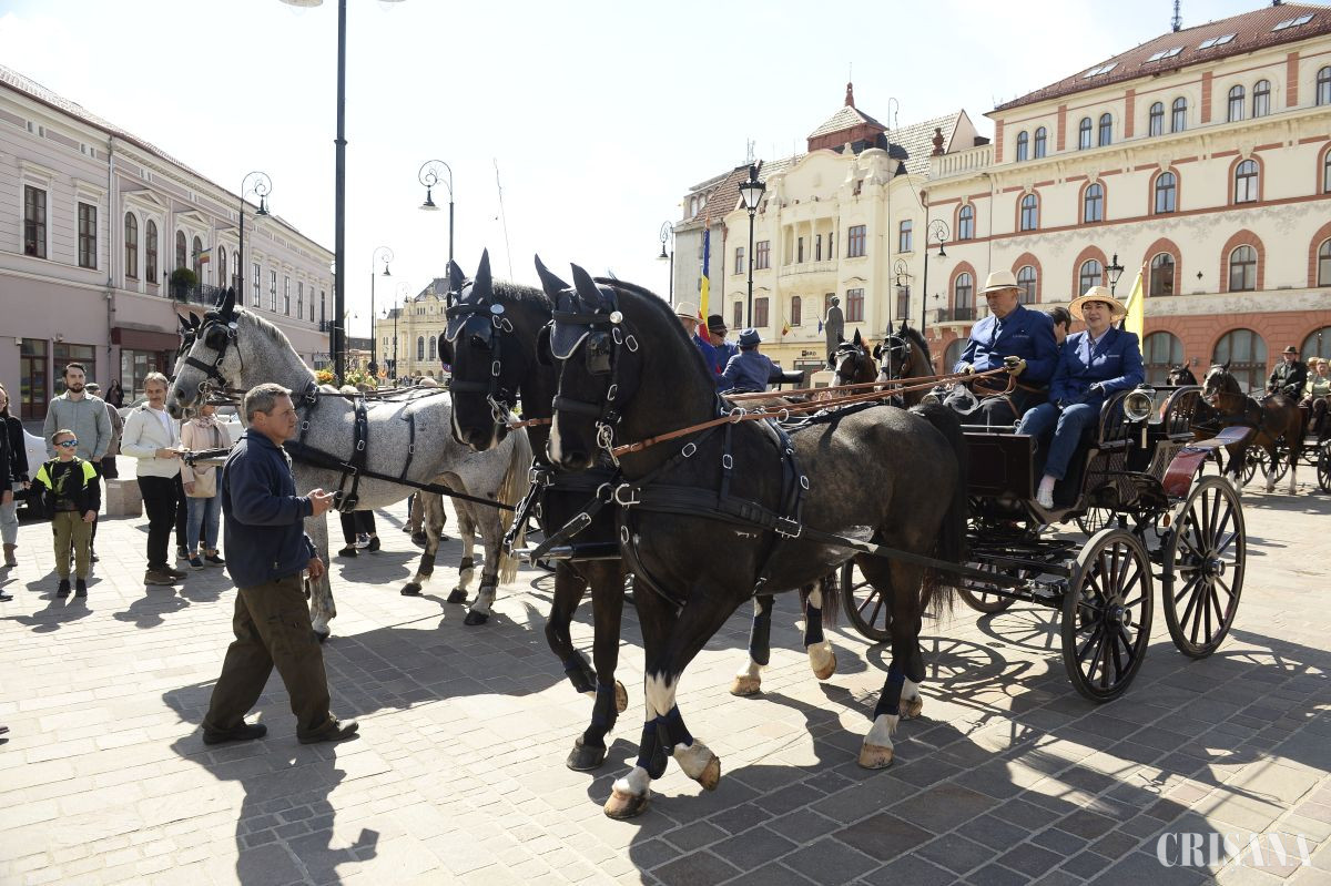 Caii de rasă, campioni internaționali, împreună cu pasagerii elegant costumaţi din atelaje, au salutat publicul pe traseu oprind la Primărie, Parcul Traian, poposind îndelung apoi pe platoul din faţa Teatrului Regina Maria, spre încântarea trecătorilor.