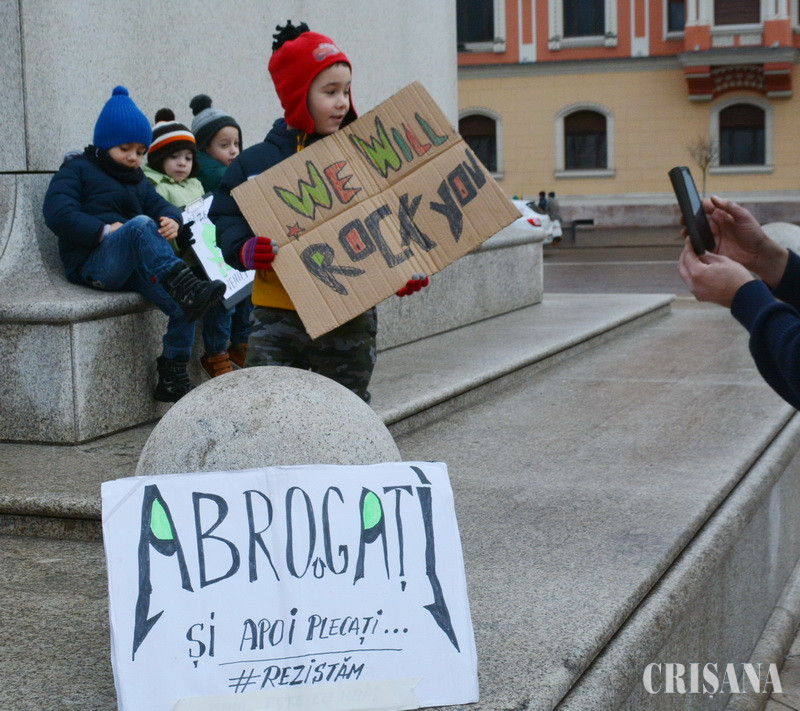 Tinerii părinţi din toată România au fost chemaţi cu cei mici la Marşul Copiilor, organizat sub sloganul „Ei au venit cu huliganii, noi am venit cu copiii”. Iar orădenii au răspuns şi de această dată „Prezent”. Peste 50 de copii, de la sugari în cărucioare, la elevi, majoritatea de şcoală primară, au fost prezenţi în 4 februarie în Piaţa Unirii, alături de părinţii lor. Protestul copiilor a fost autorizat în intervalul orar 12.00-15.00, iar prezenţa celor mici ar fi fost, probabil, mai numeroasă, dacă acest interval nu ar fi corespuns cu programul de somn al majorităţii copiilor din învăţământul preşcolar.