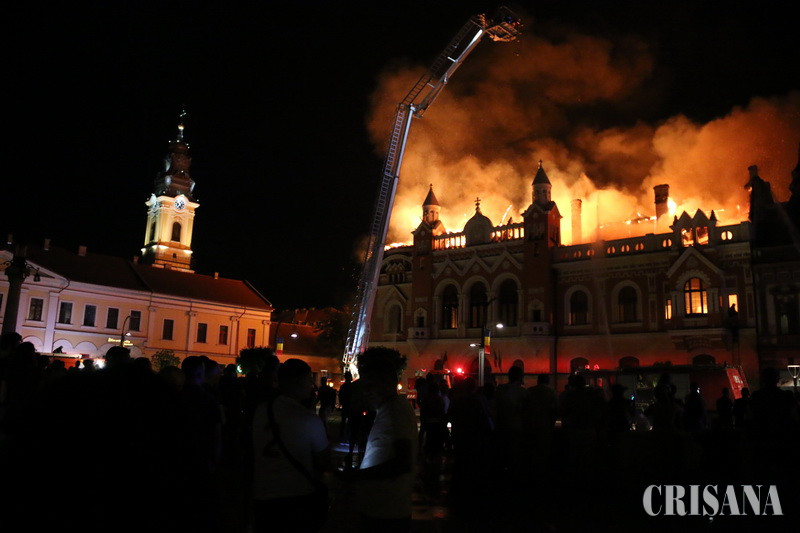 Scene şocante în centrul Oradiei. Acoperişul sediului Episcopiei greco-catolice din Oradea a fost cuprins de flăcări. Incendiul este urmărit de sute de orădeni aflaţi în Piaţa Uniri. Zeci de echipaje de pompieri aruncă apă pe clădire şi pe imobilele învecinate pentru a preveni extinderea incendiului.