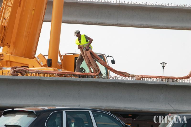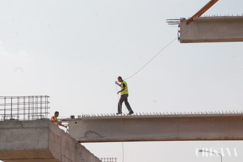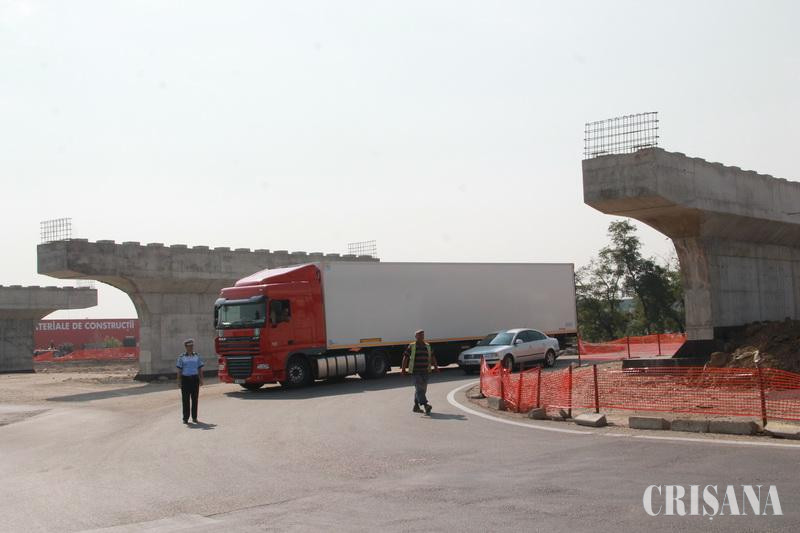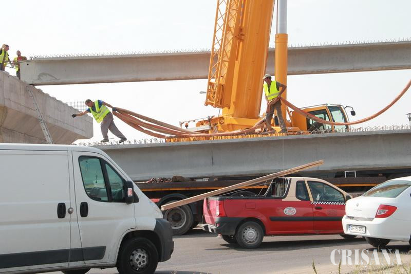 Ieri, în intervalul orar 8.00-18.00, circulația auto în sensul giratoriu de pe Calea Aradului (intersecția între drumul de centură al municipiului Oradea și drumul național DN 79 Arad-Oradea) a fost resctricționată din cauza lucrărilor de montare a grinzilor la pasaj, pe deschiderea nr. 6. Traficul rutier la ieșirea din oraș a fost deviat către sensul giratoriu din intersecția străzii Ovid Densuşianu cu Calea Sîntandrei. În aceste condiţii, întreaga zi s-a circulat cu dificultate pe toate sensurile de mers. În jurul orei 11.00, la momentul în care prima grindă a început să fie montată, timp în care preţ de câteva minute circulaţia a trebuit complet oprită pentru a se evita orice incident, coloana de maşini pornea de la sensul giratoriu de pe Calea Aradului şi ajungea până în dreptul Cimitirului Municipal. Lucrările de montare a grinzilor sunt unele anevoioase, necesitând peste 20 de minute pentru fiecare grindă. În prima fază, odată asigurate, grinzile sunt ridicate de probă, abia apoi cu ajutorul unei macarale grinda de 27 de tone este montată pe poziţie. În acest ritm, ieri, întreaga zi au fost montate 15 grinzi peste deschiderea nr. 6, între pilele 5 şi şase. Grinzile sunt din beton şi fier, proiectul prevăzând că, până la final, peste toate deschiderile pasajului să fie montate 135 de bucăţi. "În total, cu cele 15 de azi, avem montate 60 de grinzi din cele 135 prevăzute în proiect", ne-a precizat ing. Vasile Boca, şef şantier în cadrul Tehnodomus Arad, antreprenorul lucrării. Până la finele acestui an, trebuie finalizat acest nou pasaj denivelat pe direcţia Borş - Cluj-Napoca.