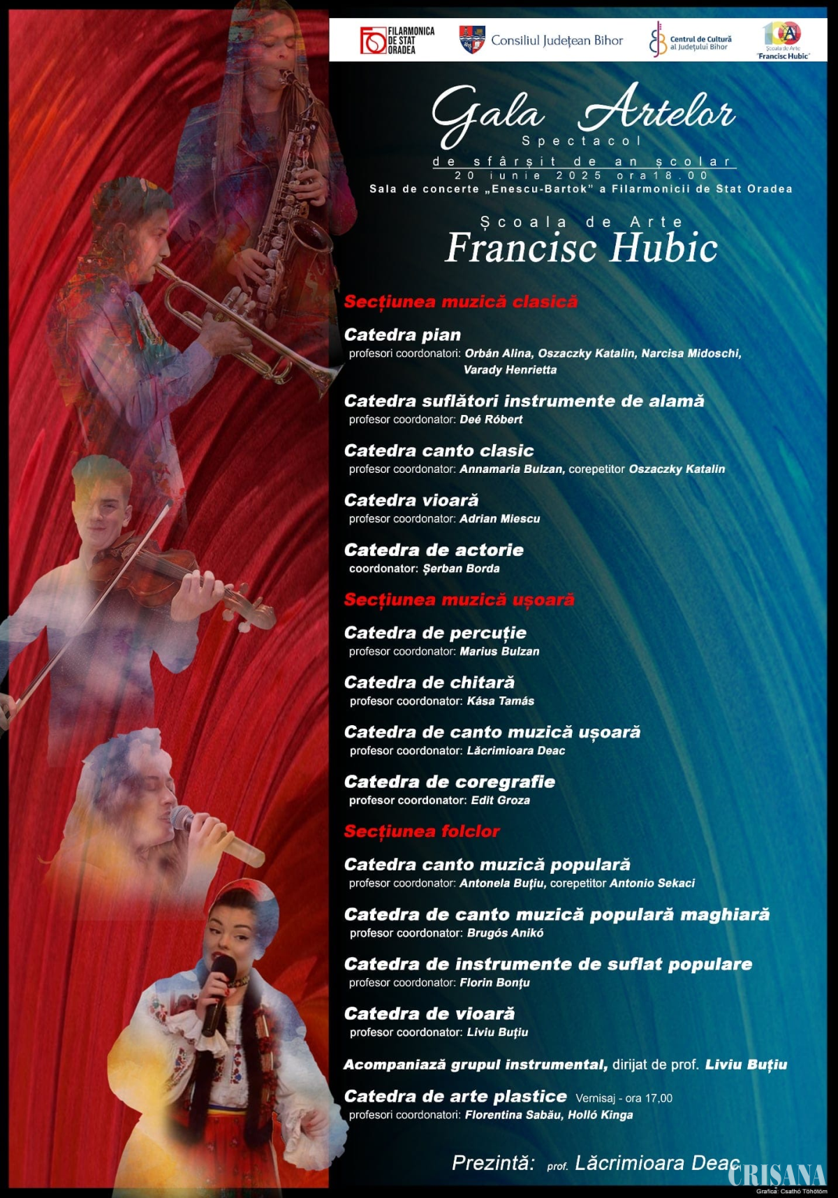 Școala de Arte „Francisc Hubic”, parte a Centrului de Cultură al Județului Bihor, organizează „Gala Artelor”, eveniment de încheiere a anului școlar, care va avea loc astăzi, 20 iunie, începând cu ora 17.00, la Filarmonica de Stat din Oradea.