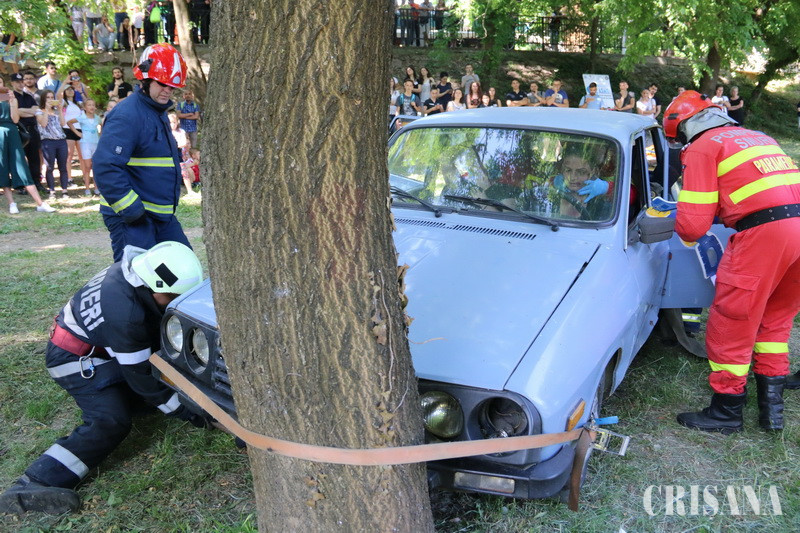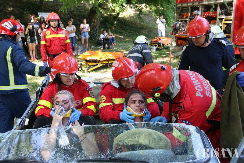 Scopul acestei activități, organizate de “Asociația Studenților Mediciniști Oradea”, în colaborare cu Inspectoratul pentru Situaţii de Urgenţă „Crişana” al județului Bihor, l-a constituit familiarizarea cetățenilor cu tehnicile de acordare a primului ajutor victimelor accidentelor rutiere și implicit, dezvoltarea, în rândul populației, a unei atitudini civice și a comportamentelor asociate acesteia. La această acțiune, alături de reprezentanții „Asociației Studenților Mediciniști Oradea”, au participat echipajul de descarcerare din cadrul Detașamentului 1 de Pompieri Oradea, echipajul de prim ajutor calificat al Detașamentului 2 de Pompieri Oradea și echipajul de terapie intensivă mobilă al SMURD Oradea. Demonstraţia s-a desfăşurat ieri, între orele 16.00 -18.00, pe malul Crișului Repede, pe raza străzii Piața Libertății din Oradea, în apropierea Podului Intelectualilor, echipajele de pompieri militari efectuând un exercițiu de descarcerare și acordare a primului ajutor calificat. Potrivit scenariului pus la cale de organizatori, două victime au rămas încarcerate într-un autoturism în urma unui accident rutier. Primii care au intervenit au fost pompierii din cadrul echipajului de descarcerare, care au extras cele două persoane din maşina avariată. Apoi, acestea au fost preluate de paramedici şi de echipajul de Terapie Intensivă Mobilă SMURD, care le-au acordat îngrijiri medicale. Toate manevrele efectuate de salvatori au fost explicate pas cu pas celor prezenţi de către un medic. Un aspect important pentru toţi cei care au asistat la exerciţiu a fost faptul că specialiştii le-au explicat ce să facă, dar mai ales ce să nu facă în cazul unui accident rutier, pentru a nu agrava starea victimelor. Potrivit reprezentanţilor Inspectoratului pentru Situaţii de Urgenţă „Crişana”, în cazul unui accident, primii care pot ajuta sunt chiar participanţii la trafic. De aceea, spun salvatorii, este important ca cetăţenii să se informeze şi să cunoască măsurile de prim ajutor de bază, care, aplicate corect şi în timp util, pot salva vieţi.