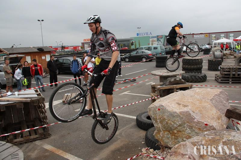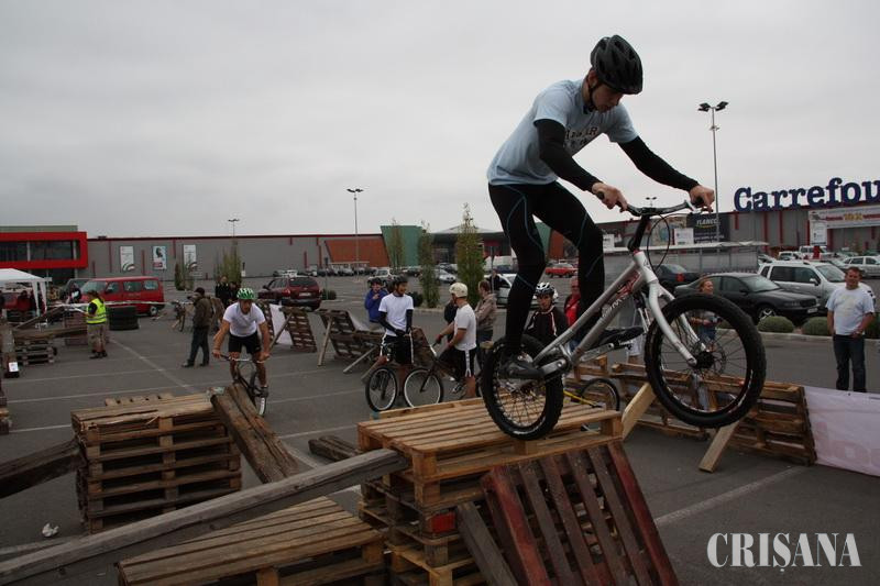 În această săptămână, la nivel european se organizează o serie de activităţi în cadrul Săptămânii Mobilităţii. Una dintre problemele majore pe care doreşte să le semnaleze acest eveniment este poluarea excesivă produsă de autoturisme. Astfel, se urmăreşte promovarea mersului pe jos, cu bicicleta sau cu mijloacele de transport în comun. În acest context, Asociaţiei Sportive Probikers a organizat sâmbătă a zecea ediţie a Trial Jam, un eveniment sportiv internaţional de trial, o ramură a ciclismului sportiv extrem. Concursul a fost structurat pe mai multe categorii: amatori, seniori, juniori şi elite. În competiţie s-au înscris peste 50 de concurenţi, din România şi Ungaria. Organizatorii au amenajat trasee complexe pentru participanţi, astfel obstacolele aduse au fost dintre cele mai diferite: de la paleţi, la traverse de beton, la tamburi sau chiar un container. "Competiţia aceasta este cea mai complexă din România şi singurul concurs internaţional. Au fost realizate 4-5 trasee, foarte spectaculoase, cu traverse de beton, cu paleţi, container etc. Un concurent parcurge aceste trasee de două-trei ori şi nu trebuie să pună piciorul jos. Pentru fiecare abatere va fi sancţionat cu puncte, cine are cele mai puţine puncte şi cel mai bun timp câştigă", ne-a declarat Mura Istvan, vicepreşedintele Asociaţiei Sportive Probikers. La competiţie a participat şi orădeanul Kiss Roland, campion naţional la categoria elite. De asemenea, cel mai tânăr concurent înscris în competiţie a fost David Molnar, de 15 ani, din Arad. La fel ca şi alţi tineri el se plânge de indiferenţa autorităţilor locale de a le asigura spaţii pentru practicarea acestui sport. "Eu abia de 3 luni practic acest sport. Ai nevoie de echilibru, răbdare şi exerciţiu fizic. Eu mă antrenez zilnic, deşi nu prea sunt amenajate spaţii speciale pentru acest sport", ne-a declarat David Molnar. Bicicleta nu poate să fie una obişnuită, ea trebuie să fie prevăzută cu un cadru cu o anumită geometrie. "Bicicleta mea a costat 700 euro, dar e praf de şantier. Una bună poate să coste peste 2.000 euro", a mai precizat David Molnar. Valoarea premiilor puse în joc s-au ridicat la 2.000 de euro.