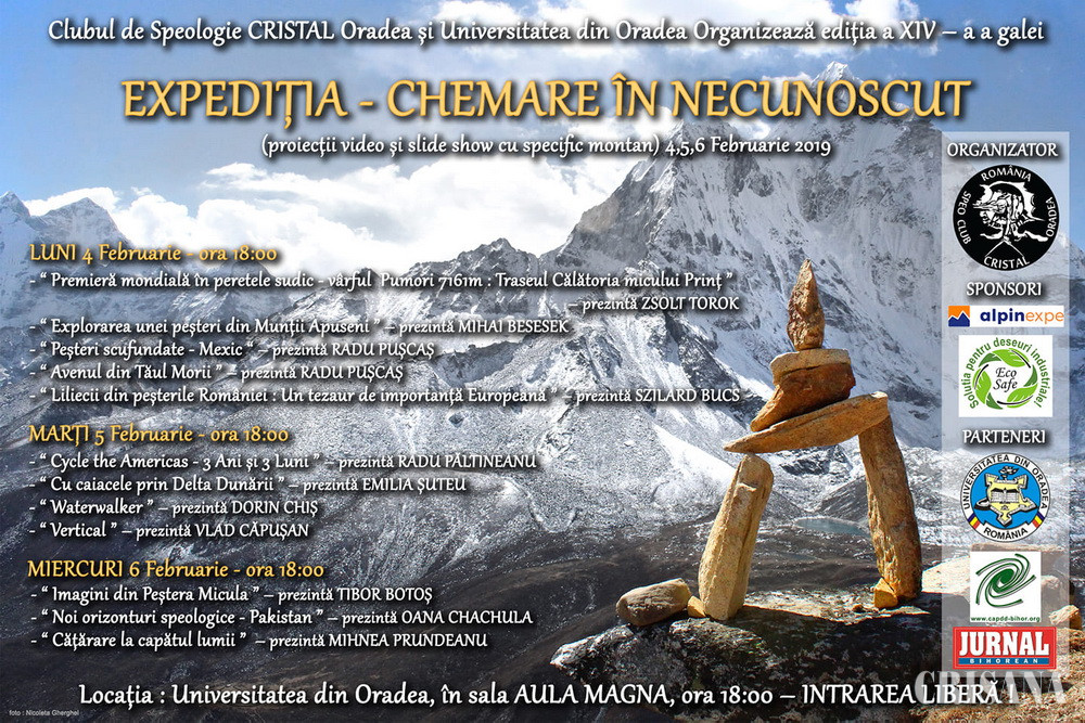 Aula Magna a Universității din Oradea este gazda ediției cu numărul 14 a galei „Expediţia – Chemare în necunoscut”, în cadrul căreia au loc proiecţii video și slideshow-uri cu specific montan. Evenimentul este organizat de Clubul de Speologie Cristal Oradea, în parteneriat cu Universitatea din Oradea.
