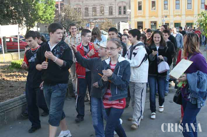 Zeci de orădeni, nemulţumiţi de modul în care municipalitatea orădeană a înţeles să demareze lucrările de reamenajare peisagistică a zonelor verzi din oraş, au organizat, în cursul serii de ieri, o amplă acţiune de protest. Aproximativ 100 de persoane, majoritatea tineri, jurnalişti şi politicieni, cu candele aprinse şi pancarte inscripţionate cu mesajul "Şi copiii noştri au nevoie de oxigen", au înconjurat în tăcere întreaga alveolă supusă distrugerii.