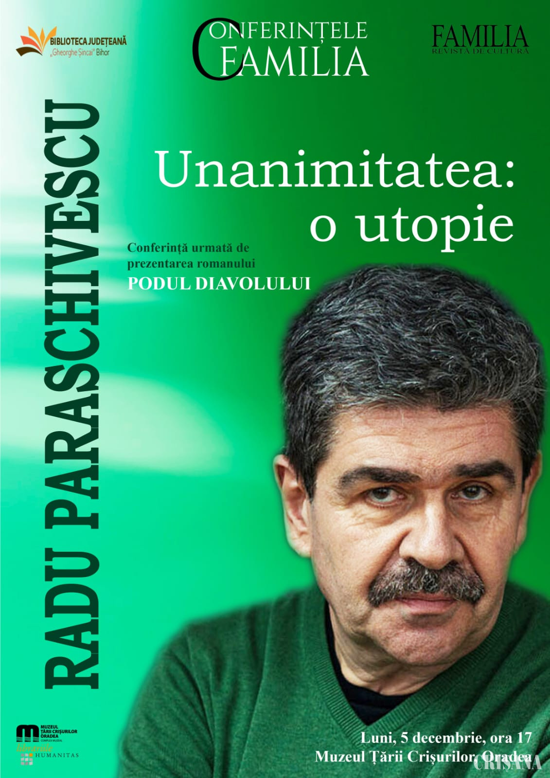 Revista de cultură Familia și Biblioteca Județeană „Gheorghe Șincai”, Oradea, cu sprijinul Muzeului Țării Crișurilor și al Librăriilor Humanitas, prilejuiesc luni, 5 decembrie, de la ora 17.00, în Amfiteatrul Muzeului Țării Crișurilor, întâlnirea și dialogul publicului cu scriitorul și traducătorul Radu Paraschivescu.