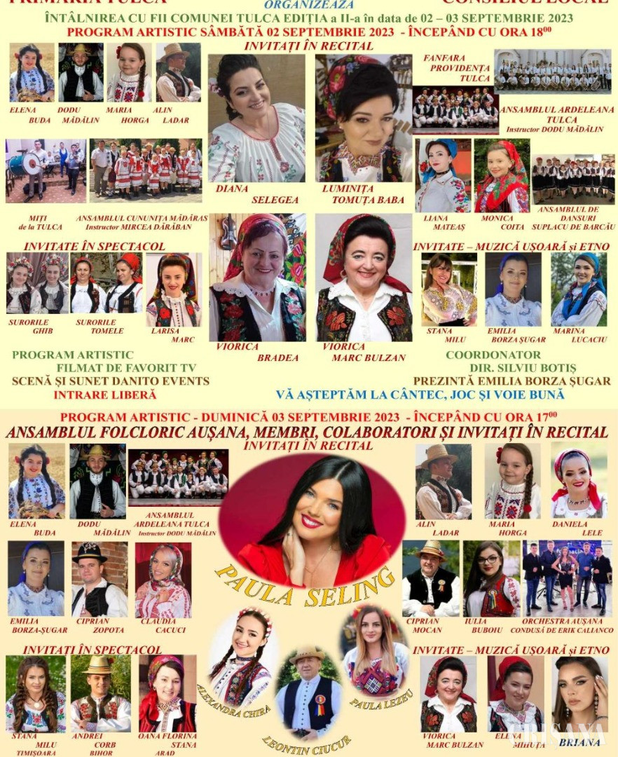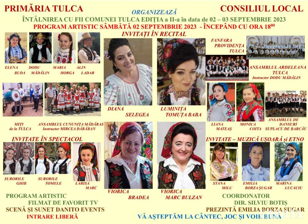 Primăria și Consiliul local Tulca organizează „Întâlnire cu fiii comunei Tulca”, ocazie cu care va avea loc un program artistic de excepție, susținut de artiști cunoscuţi.