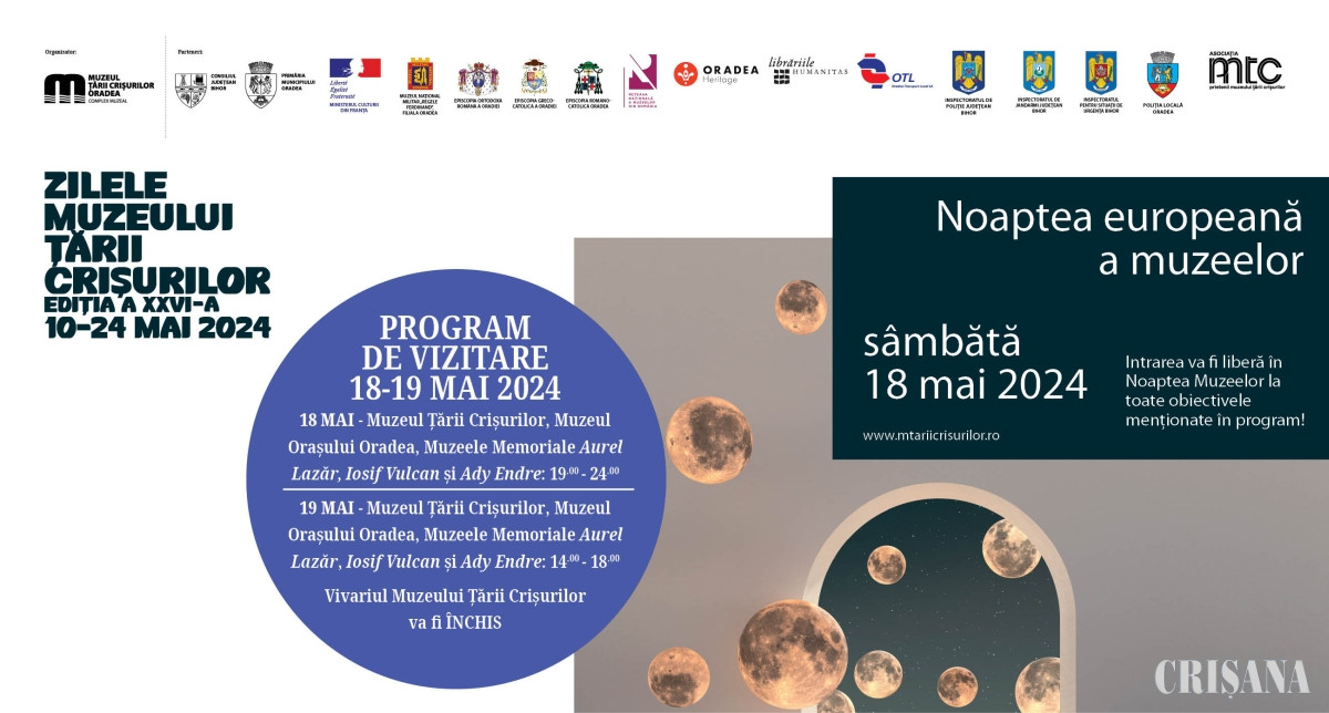Pentru zilele de 18 și 19 mai 2024, programul muzeelor din subordinea Muzeului Țării Crișurilor Oradea – Complex Muzeal va fi următorul: