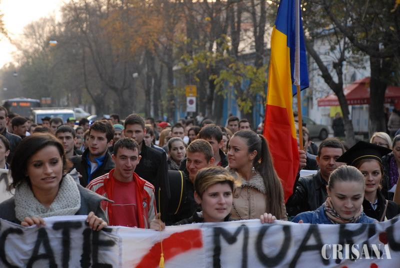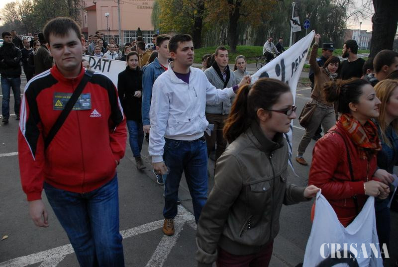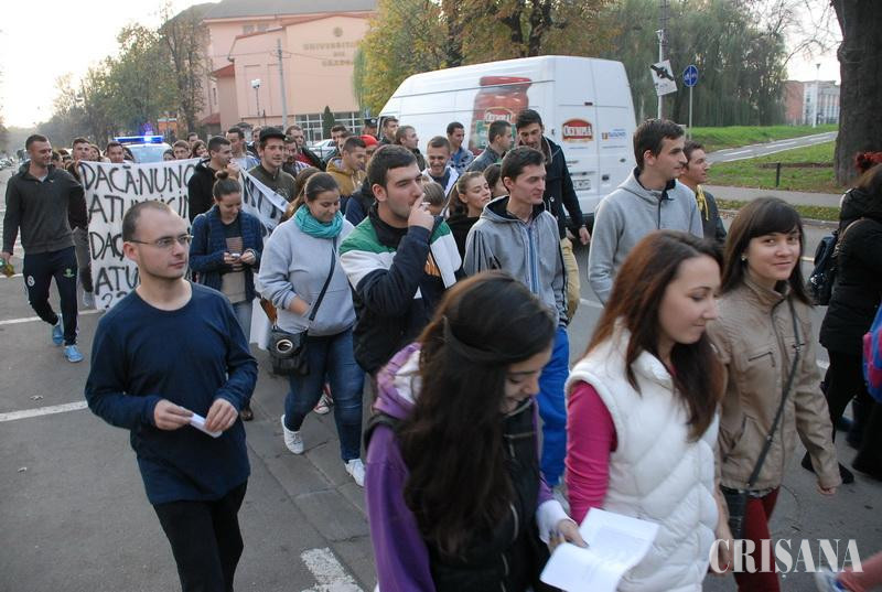 În jur de 150 de studenţi orădeni au cerut ieri în stradă Guvernului alocarea a 6% din PIB pentru Educaţie, creşterea finanţării universităţilor, a subvenției pentru cămine şi cantine cu 30%, a fondului de burse cu destinație către bursele sociale și investiții reale în centrele de consiliere și orientare în carieră, plus o metodologie care să definească normele de funcționare ale acestora. Alături de studenţi, la proteste au putut fi zăriţi şi preşedintele Senatului Universităţii din Oradea, Sorin Curilă şi cancelarul general al Senatului, Vasile-Aurel Căuş. Coloana de studenţi, condusă de preşedintele Asociaţiei "Gheorghe Şincai", Roland Olah, a fost însoţită de 10 jandarmi şi două maşini şi s-a deplasat pe traseul Universitatea din Oradea - Piaţa Unirii - str. Republicii - Parcul Traian - Parcul 1 Decembrie - Piaţa Independenţei (Piaţa Emanuil Gojdu) - Piaţa Unirii - Universitatea din Oradea. Studenţii au purtat pancarte cu inscripţii precum "Fără educaţie moare orice naţie" sau „Nu vrem să ajungem să furăm, daţi-ne bani să învăţăm!". Au existat însă şi mulţi nemulţumiţi, coloana de maşini de pe strada Armatei Române ajungând la un moment dat de la Oficiul de cadastru până mai sus de sediul Universităţii. Prinşi în trafic în autobuzul OTL, mai mulţi studenţi orădeni care nici nu se gândiseră să iasă la protest s-au declarat nemulţumiţi de viteza cu care circula autovehiculul. "Am ieşit în stradă pentru că vrem ca cei care ne conduc să respecte Legea Educaţiei Naţionale şi să aloce, măcar în anul care vine, 6% din PIB. Subfinanţarea sistemului este o mare problemă atât pentru profesori, cât şi pentru noi, universităţile fiind nevoite să crească taxele pentru a se salva. Aşa nu se poate face nimic în acest domeniu!", a spus Roland Olah, cel care a condus coloana cu demonstranţi. Protestul a fost organizat de Asociaţiile din Convenţia Organizaţiilor Studenţeşti din cadrul Universităţii din Oradea şi Asociaţia „Gheorghe Şincai" şi s-a înscris în ciclul de manifestări organizate în toate centrele universitare din ţară.
