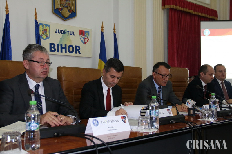 Joi, în sala de şedinţe a Consiliului Judeţean Bihor, a avut loc semnarea contractelor de finanţare pentru patru proiecte derulate de Consiliul Judeţean Bihor. La eveniment au fost prezenţi vicepremierul Paul Stănescu, ministru al dezvoltării regionale, ministrul delegat pentru Fonduri Europene, Marius Nica, şi secretarul de stat în Ministerul Dezvoltării Regionale, Adrian Gâdea, responsabil cu Programul Naţional de Dezvoltare Locală. De asemenea, din partea judeţului Bihor au fost prezenţi atât preşedintele CJ Pasztor Sandor, cât şi cei doi vicepreşedinţi, Ioan Mang şi Traian Bodea. „Este o zi foarte importantă pentru judeţul Bihor. Vom semna contractele cu cele mai mari sume de investiţii pentru infrastructura judeţului Bihor”, a anunţat Pasztor Sandor, menţionând că două dintre cele patru proiecte vor fi finanţate prin Programul Operaţional Regional 2014-2020, iar celelalte două prin PNDL, etapa a doua. Primul proiect pentru care s-a semnat contractul de finanţare a fost etapa a doua a reabilitării sediului Muzeului Ţării Crişurilor. Proiectul, în valoare totală de 5,5 milioane euro presupune lucrări de amenajare și dotări interioare pentru clădirea monument istoric în care este adăpostit MTC (etajul I – secţia Ştiinţele naturii şi secţia de Istorie). De asemenea, în cadrul acestei investiții se vor realiza și lucrări de amenajare a spațiului public aferent curții muzeului, în suprafață de 20.800 mp, reabilitarea porții principale de acces (parte integrantă din monumentul istoric), curățarea terenului și amenajarea spațiului verde, construirea unui amfiteatru, amenajarea unui spațiu de așteptare, repararea fântânii după intervențiile aferente proiectului, pavarea aleilor (inclusiv montarea de benzi tactile pentru nevăzători), parcări, repararea și completarea împrejmuirii, restaurarea cabinei de pază, realizarea unui sistem de iluminat arhitectural precum și montarea de mobilier urban. Termenul pentru acest proiect este de trei ani de la semnarea contractului de execuţie, însă Pasztor Sandor speră că lucrările vor fi finalizate mult mai repede. „La Muzeu mai avem o etapă de reabilitare - proiectul strategic la care lucrăm cu Debreţin. Avem toate datele să terminăm mult mai repede lucrările. Cum terminăm un etaj, cum îl dăm în folosinţă”, a menţionat preşedintele CJ Bihor.