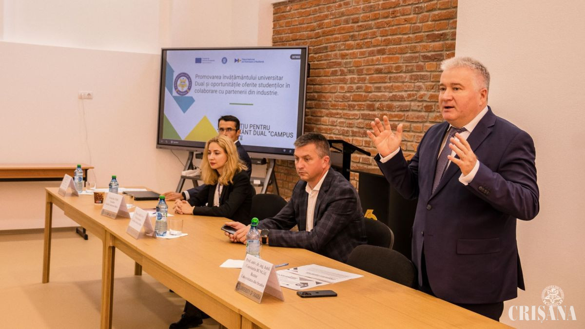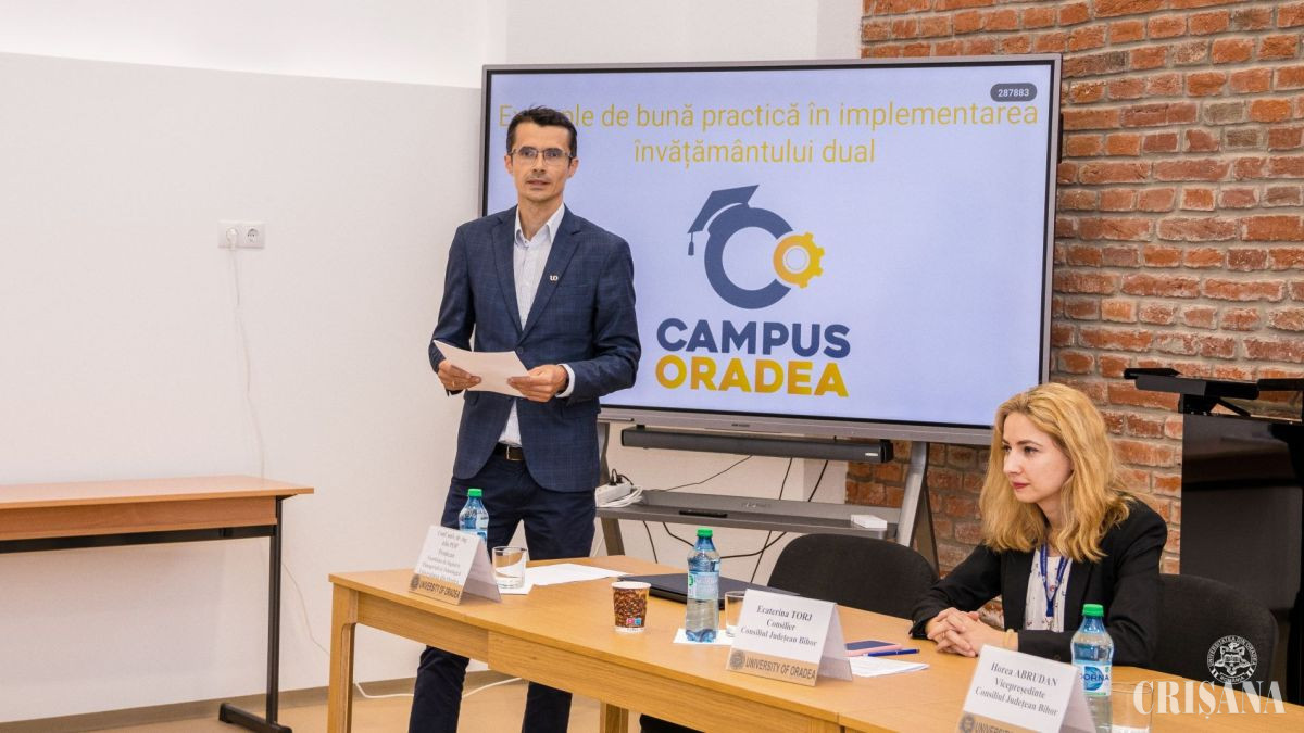 Reprezentantul Universității din Oradea în proiectul „Consorțiu pentru învățământ dual Campus Oradea”, conf. univ. dr. Alin Pop, prodecanul Facultății de Inginerie Managerială și Tehnologică, a subliniat că evenimentul își propune să fie „un dialog, între parteneri, cu privire la modul în care se îmbină pregătirea academică cu practica în mediul real de muncă”. Referindu-se la proiectul Campusului Dual Oradea, Horea Abrudan, vicepreședinte al Consiliului Județean Bihor, a precizat că această instituție de învățământ reflectă viziunea administrației cu privire la dezvoltarea economică a județului, care își propune să ducă locurile de muncă mai aproape de cei care lucrează.