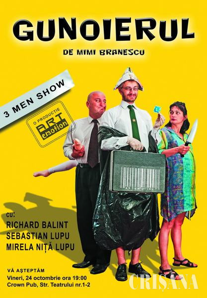 Următoarea reprezentație pe care Teatrul Artemotion v-o propune în Crown Pub vineri, 24 octombrie, de la ora 19:00, este cea a supercomediei de club „Gunoierul" de Mimi Brănescu, unul dintre cei mai importanți scriitori ai genului, de altfel este şi scenaristul celebrului serial Las Fierbinți, cu actorii Richard Balint, Sebastian Lupu și Mirela Lupu, care sunt de fapt trei din cei patru membri fondatori ai Teatrul Artemotion.