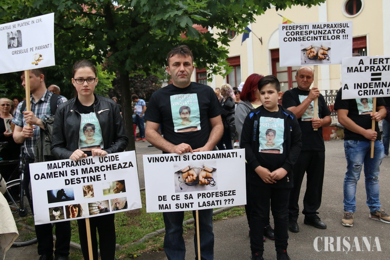 Protestul de ieri a fost iniţiat de Delia Scorţe, mama Patriciei Aktaa, fetiţa în vârstă de cinci ani care a murit în 2010, la spital, după ce a mâncat o prăjitură infestată cu Salmonella. Manifestarea a fost organizată după ce, luna trecută, magistraţii Judecătoriei Oradea au achitat-o pe doctoriţa Georgeta Călinescu, medicul trimis în judecată pentru ucidere din culpă în dosarul morţii Patriciei. Familia copilei i-au acuzat pe medicii de la Spitalul de Boli Infecţioase că nu au luat măsurile necesare în acest caz şi că au întârziat nepermis de mult transferul copilului la Secţia de terapie intensivă a Spitalului Municipal. La şapte ani de la moartea Patriciei, familia a decis să organizeze un protest în faţa Tribunalului Bihor. „La şapte ani de la plecarea Patriciei, ca o reacţie faţă de toate cazurile de malpraxis, organizăm acest protest. Nu e vorba doar despre cazul nostru. Este vorba despre toţi cei care nu au avut poate timp sau puterea de a reacţiona. Este un protest tacit, vorbesc doar mesajele de pe pancarde”, a menţionat Delia Scorţe. Câteva zeci de persoane au răspuns apelului mamei Patriciei, sosind ieri în faţa Tribunalului Bihor cu pancarte pe care se puteau citi mesaje ca: „Malpraxisul=crimă”, „Mai credem în justiţie! Încă!” sau „Operaţia a reuşit, pacientul a murit”. Printre cei prezenţi ieri s-au numărat rudele unor bihoreni care şi-au pierdut viaţa în spitale sau care au rămas cu handicap sever în urma unor tratemente necorespunzătoare, după cum au susţinut aparţinătorii. „Trebuie să se ştie că lumea nu mai tolerează malpraxisul. Este timpul ca astfel de cazuri să fie investigate aşa cum trebuie. Comisiile care le anchetează, Colegiile Medicilor, să recunoască faptul că există malpraxis. Domnii procurori şi domnii judecători trebuie să le sancţioneze corespunzător. Iertând şi închizând ochii nu vom face decât să încurajăm malpraxisul”, a declarat, ieri, Delia Scorţe. Prezent la protest a fost şi avocatul Răzvan Doseanu, apărătorul familiei Scorţe. „Consider soluţia Judecătoriei una nedreaptă şi netemeinică. Ne vom face apărarea în sala de judecată, am declarat apel”, a precizat avocatul. Alături de familia Patriciei, ieri, la protest, a fost şi Dorel Gruie, soţul Marcelei Gruie, o tânără în vârstă de 28 de ani care a murit pe masa de operaţie, în 2006, la Spitalul din Beiuş, în timpul unei operaţii de cezariană. Cu el au fost şi cei doi copii dar şi alte rude. Cazul Gruie este primul din Bihor în care doi medici au ajuns în faţa instanţei şi au fost şi condamnaţi pentru malpraxis. În anul 2011, Curtea de Apel Oradea s-a pronunţat în dosarul deschis pe numele anestezistului Vladimir Topală şi al ginecologului Radu Scridon. Cei doi medici din cadrul Spitalului Municipal din Beiuş au fost condamnaţi la închisoare cu suspendare. Ginecologul Radu Scridon a primit 2 ani de închisoare cu suspendare condiţionată pe durata unui termen de încercare de 4 ani iar anestezistul Vladimir Topală, 3 ani de închisoare, cu suspendarea condiţionată pe o perioadă de probă de 5 ani. Totodată, judecătorii au decis ca cei doi să achite daune morale copiilor rămaşi orfani de mamă şi soţului Marcelei Gruie, în valoare de aproape 150.000 de euro. Marcela Gruie a murit în 17 noiembrie 2006, în timpul unei operaţii de cezariană cu rahianestezie. În timpul intervenţiei chirurgicale, la câteva minute după anestezie, femeia a făcut stop cardio-respirator, iar după 20 de minute a murit. Autopsia a evidenţiat existenţa unei culpe medicale. “Am decis să venim astăzi aici pentru că eu ştiu ce înseamnă să te lupţi cu sistemul. Este o luptă foarte grea, simţi că te lupţi cu morile de vânt. În cazul nostru, cei doi medici au fost condamnaţi cu suspendare. Nu sunt mulţumit de pedeapsă. Au greşit şi au primit o pedeapsă mult prea uşoară. Profesează în continuare. Domnul Topală a fost chiar avansat, acum este şef de secţie”, a declarat Dorel Gruie. În privinţa daunelor stabilite de instanţă, acesta a precizat că familia sa a intrat în cele din urmă în posesia sumelor de bani, la multă vreme însă de la decizia instanţei.