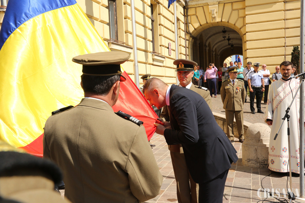 După primirea tricolorului și legarea acestuia la catargul de arborare, preotul militar al Garnizoanei Oradea, Mircea Ioniță, a binecuvântat drapelul, care a fost înălțat pe catarg, nu înainte de a fi sărutat de către oficialitățile prezente la ceremonie: prefectul Ioan Mihaiu, vicepreşedintele Consiliului Județean Bihor, Traian Bodea, primarul Ilie Bolojan, PS Sofronie, episcopul ortodox al Oradiei şi de către comandantul Garnizoanei Oradea, locotenent-colonelul Călin Trip.