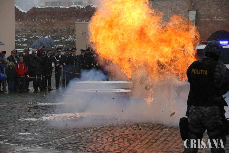 După şedinţa festivă, evenimentele dedicate cetăţenilor au fost desfăşurate anul acesta în Cetatea Oradea, acolo unde au fost prezentate activităţile pe care le desfăşoară zi de zi poliţiştii bihoreni, dar şi dotările de care aceştia dispun în executarea misiunilor, pe ateliere de lucru. IPJ Bihor a organizat şi o expoziţie inedită de fotografie, „100 de ani de poliție în județul Bihor”, în Muzeul Cetății Oradea – Poliția Bihoreană în imagini și documente de la 1918 până în prezent. Orădenii prezenţi în Cetate, în ciuda condiţiilor meteo, au avut ocazia să asiste la prezentarea dotărilor autolaboratorului criminalistic, cu suportul de specialitate al poliţiştilor criminalişti bihoreni dar şi să afle mai multe despre armamentul şi tehnica din dotarea Poliţiei Bihorene. Tot în Cetate au fost amplasate standuri de documentare – informare în cadrul cărora au fost distribuite pliante, broşuri şi alte materiale de promovare a profesiei de poliţist şi cu conţinut educativ – preventiv. Cele mai aşteptate momente au fost şi anul acesta demonstraţiile şi exerciţiile tactice ale luptătorilor Serviciului pentru Acţiuni Speciale şi ale unităţii canine. Chiar dacă vremea nu a fost prielnică, zeci de copii i-au urmărit entuziasmaţi pe “mascaţi”. Primul exerciţiu l-a avut ca protagonist pe Ren, un ciobănesc german în vârstă de cinci ani, care a efectuat o demonstraţie de dresaj iar apoi, alături de conductorul său, a imobilizat o persoană recalcitrantă. Luptătorii şi pirotehniştii au prezentat un exerciţiu de interceptare în trafic a unui grup de infractori şi au neutralizat un colet care conţinea un dispozitiv exploziv improvizat. Cel mai spectaculos exerciţiu a fost însă cel care, potrivit scenariului, un grup infracţional format din trei persoane a fost prins în flagrant în timp ce comitea un jaf armat la o bancă, tâlharii fiind rapid imobilizaţi şi reţinuţi de luptătorii SAS.