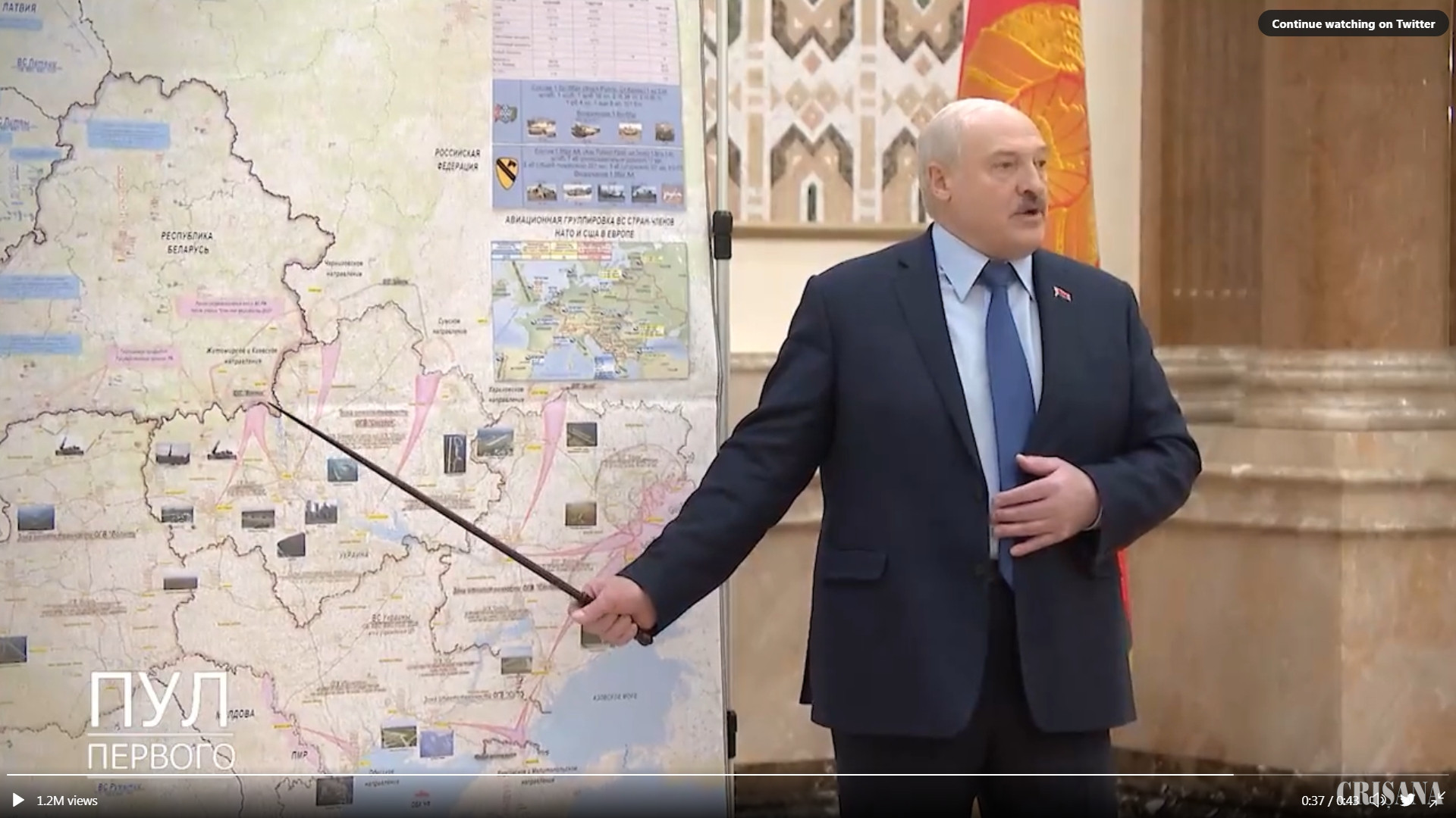 Un scurt videoclip distribuit de jurnalistul belarus Tadeusz Giczan pe Twitter îl arată pe Lukaşenko arătând spre o hartă a Ucrainei care o arată segmentată în patru părţi. Giczan a numit-o „ceea ce arată ca o hartă reală a invaziei”. Lukaşenko, un aliat apropiat al preşedintelui rus Vladimir Putin, s-a adresat marţi consiliului său de securitate în timp ce stătea în faţa unei hărţi cu direcţiile de atac ale trupelor ruse în Ucraina, scrie Business Insider. Harta părea să arate planuri de mişcare a trupelor şi ţinte de infrastructură în Ucraina, precum şi ţinte în regiunea separatistă Transnistria. Unele operaţiuni indicate pe hartă au avut loc deja, în timp ce altele urmează să de desfăşoare, inclusiv o incursiune în Republica Moldova dinspre oraşul-port Odessa.