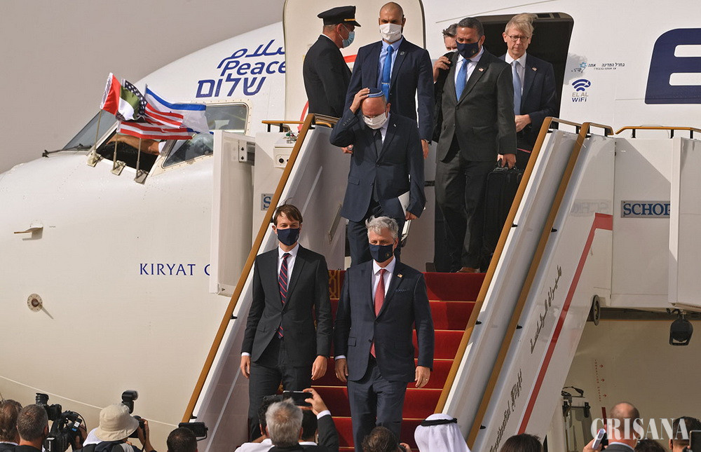Avionul companiei israeliene El Al, a decolat de pe aeroportul Ben Gurion din Tel Aviv şi a aterizat la Abu Dhabi la ora locală 15.39 (11.39 GMT), după ce a survolat Arabia Saudită, conform unei echipe a AFP. Delegaţia americană este condusă de Jared Kushner, ginerele preşedintelui american Donald Trump şi consilier la Casa Albă, şi de Robert O'Brien, consilierul pentru securitate naţională al lui Trump. Echipa israeliană îl are în frunte pe omologul lui O'Brien, Meir Ben-Shabbat.