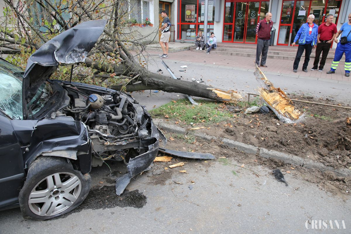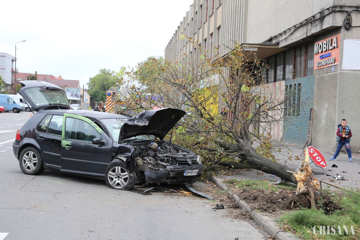 Accident spectaculos în Oradea, din fericire fără victime. În fața magazinului Penny de pe bulevardul Ștefan cel Mare, sâmbată în jurul orei 16.00, pe sensul spre Gara Oradea dinspre intersecția cu str. Transilvaniei, un autoturism în care se aflau trei tineri a spulberat un copac aflat pe marginea bulevardului.