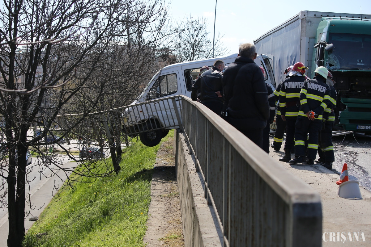 Un accident rutier spectaculos s-a produs pe pasajul ce supratraversează Bulevardul Dacia, spre Vama Borş. O autoutilitară aparţinând OTL a fost pur şi simplu aruncată peste parapet de un camion de transport marfă.